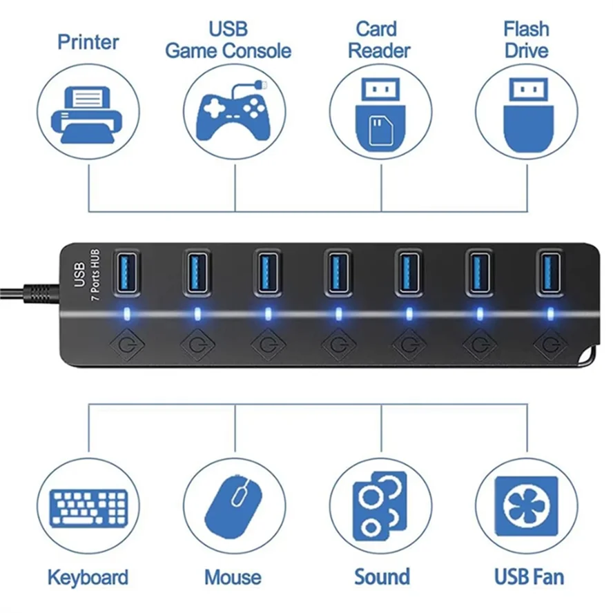 Agregue instantáneamente puertos 7/4 (USB 2.0/USB3.0) a cualquier dispositivo electrónico conectándolo a su computadora y luego conecte su mouse, teclado, discos duros externos, unidades flash y mucho más.