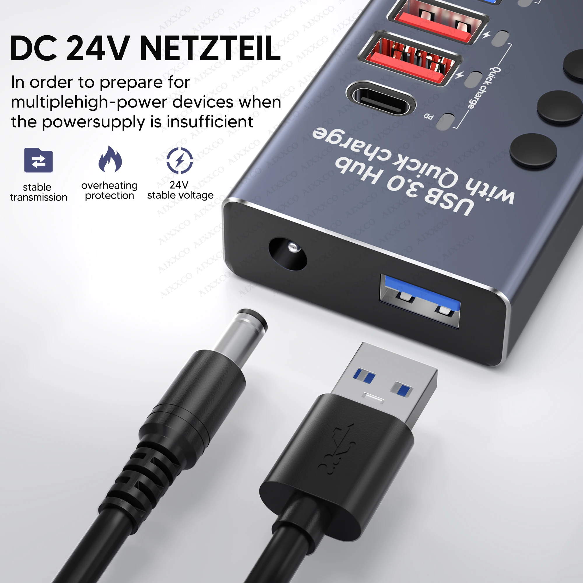 HUB USB 3.0 alimentado, con una artesanía exquisita y texturas únicas, ideal para ampliar el puerto USB 3.0 de su PC, taptop, smart TV y host de juegos.Velocidad de transferencia de datos de hasta 5 Gbps, además de función de carga rápida, una excelente opción para ahorrar tiempo y espacio.