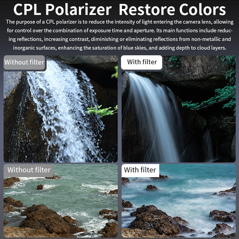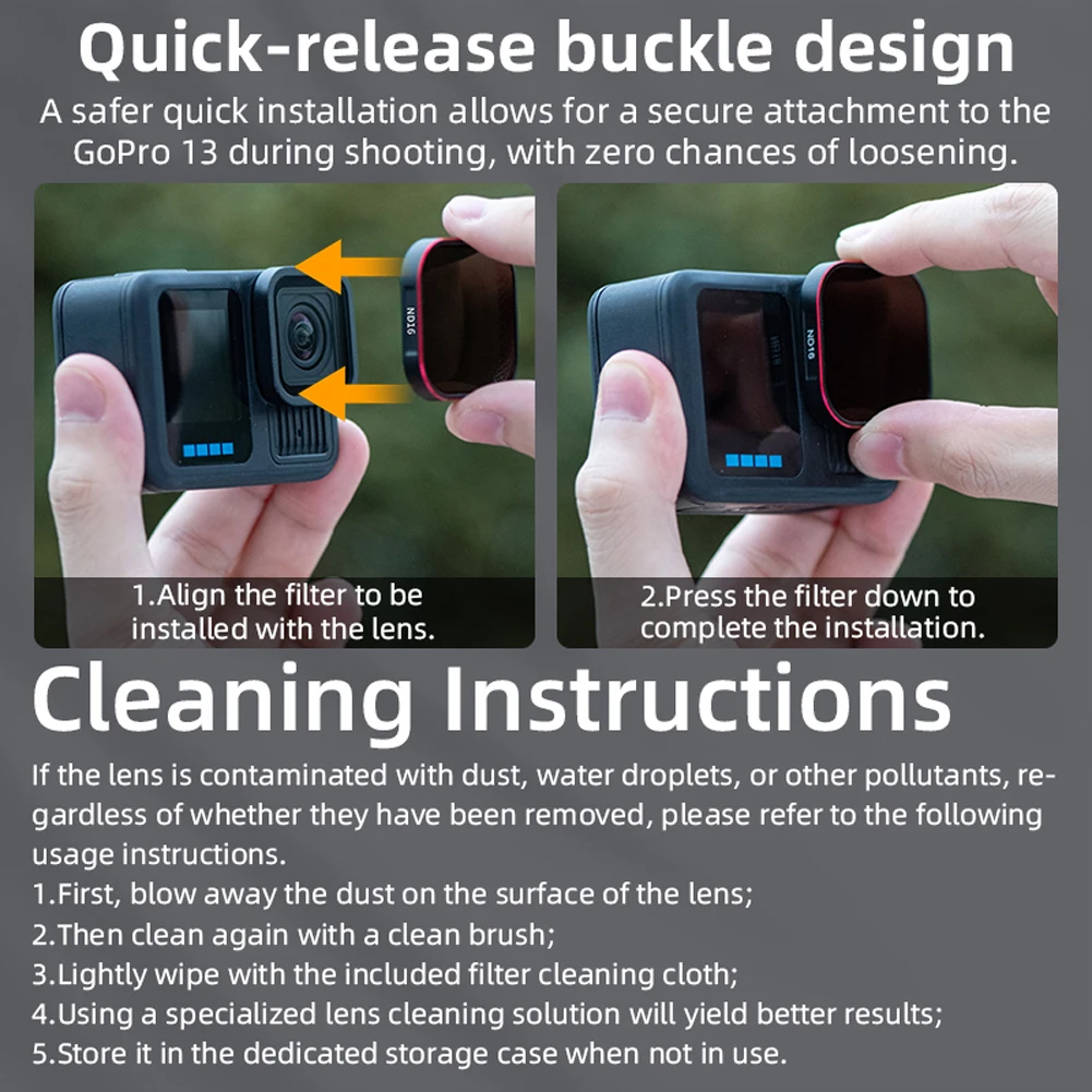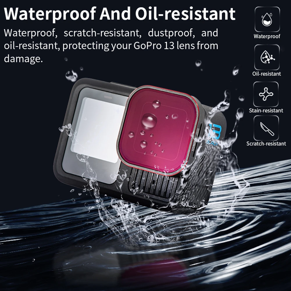 1.Perfectoompatible conGOPRO 13:Este juego de filtros cpl nd8 nd16 nd32 está diseñado específicamente en Compatible conGOPRO 13, con revestimientos multicapa que son impermeables, resistentes a los arañazos, al polvo y al aceite.Proteja su lente desde todos los ángulos mientras disfruta de efectos de filtro ND y CPL versátiles.