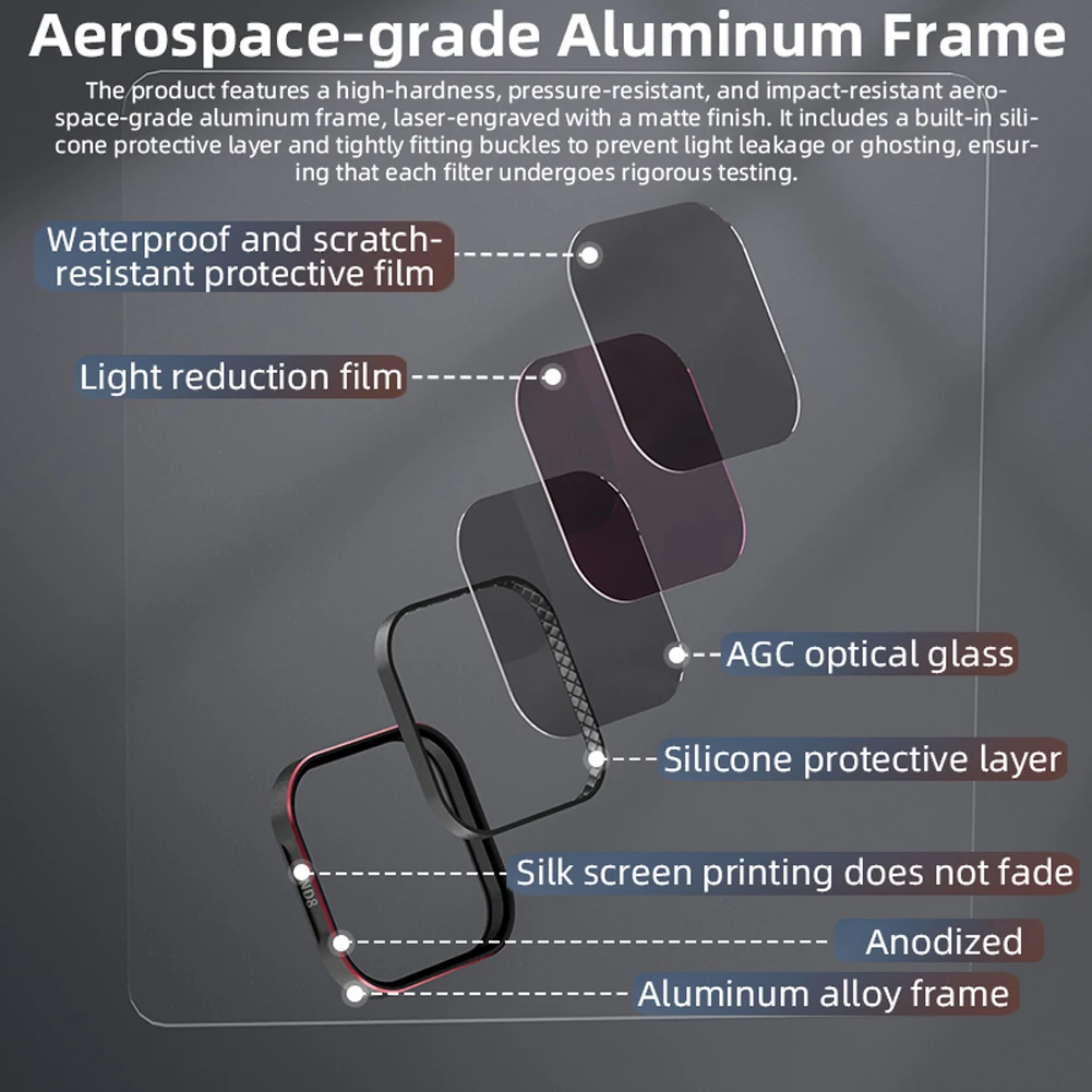 3.Marco de aluminio de grado aeroespacial:Los filtros cuentan con un marco de aluminio negro mate grabado que evita fugas de luz y imágenes fantasma.Cada filtro polarizador de densidad neutra se prueba rigurosamente para verificar su calidad y el diseño liviano garantiza que pueda disparar sin una carga adicional.