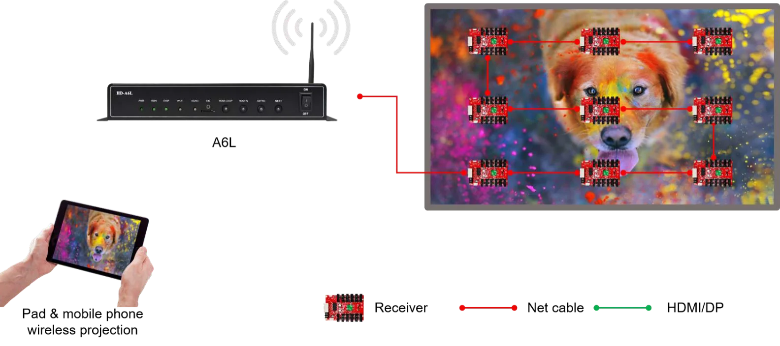 A6L es un reproductor multimedia con pantalla LED que admite la reproducción de vídeos, imágenes, animaciones GIF, textos, documentos WPS, tablas, relojes, cronometrajes y otros programas.Integra funciones como reproducción asíncrona, reproducción sincrónica y reproducción de empalme HD, compatible con programas de liberación y control multiterminal.