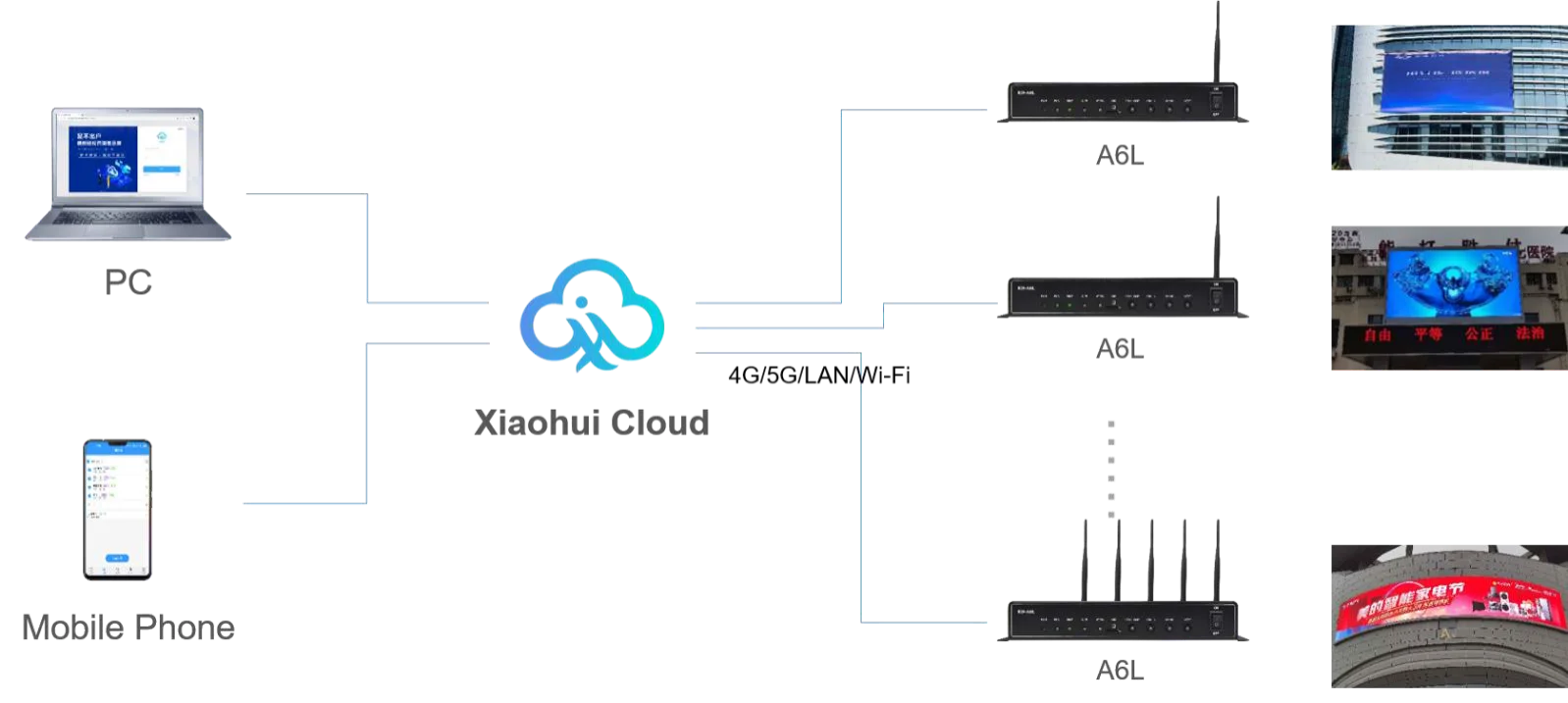 Configuración estándar de Wi-Fi de doble banda, compatible con aplicación de teléfono móvil - control inalámbrico "LedArt";admite visualización de pantalla inalámbrica de teléfono móvil/tableta;admite acceso a la plataforma "Xiaohui Cloud", fácil de lograr gestión de clúster remoto por Internet;El espacio de almacenamiento de capacidad hace que la reproducción asíncrona sea sin preocupaciones;Admite la conexión externa de varios sensores de monitoreo ambiental para realizar la visualización en tiempo real de los datos de monitoreo ambiental.