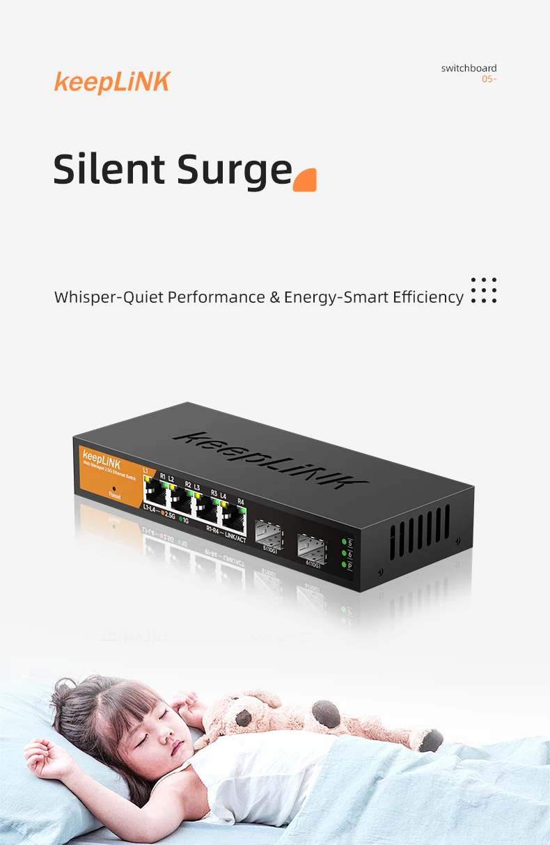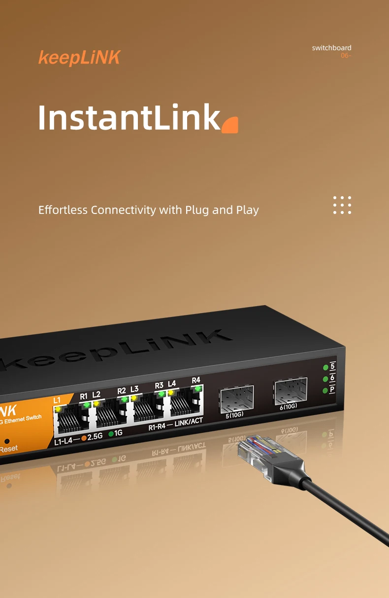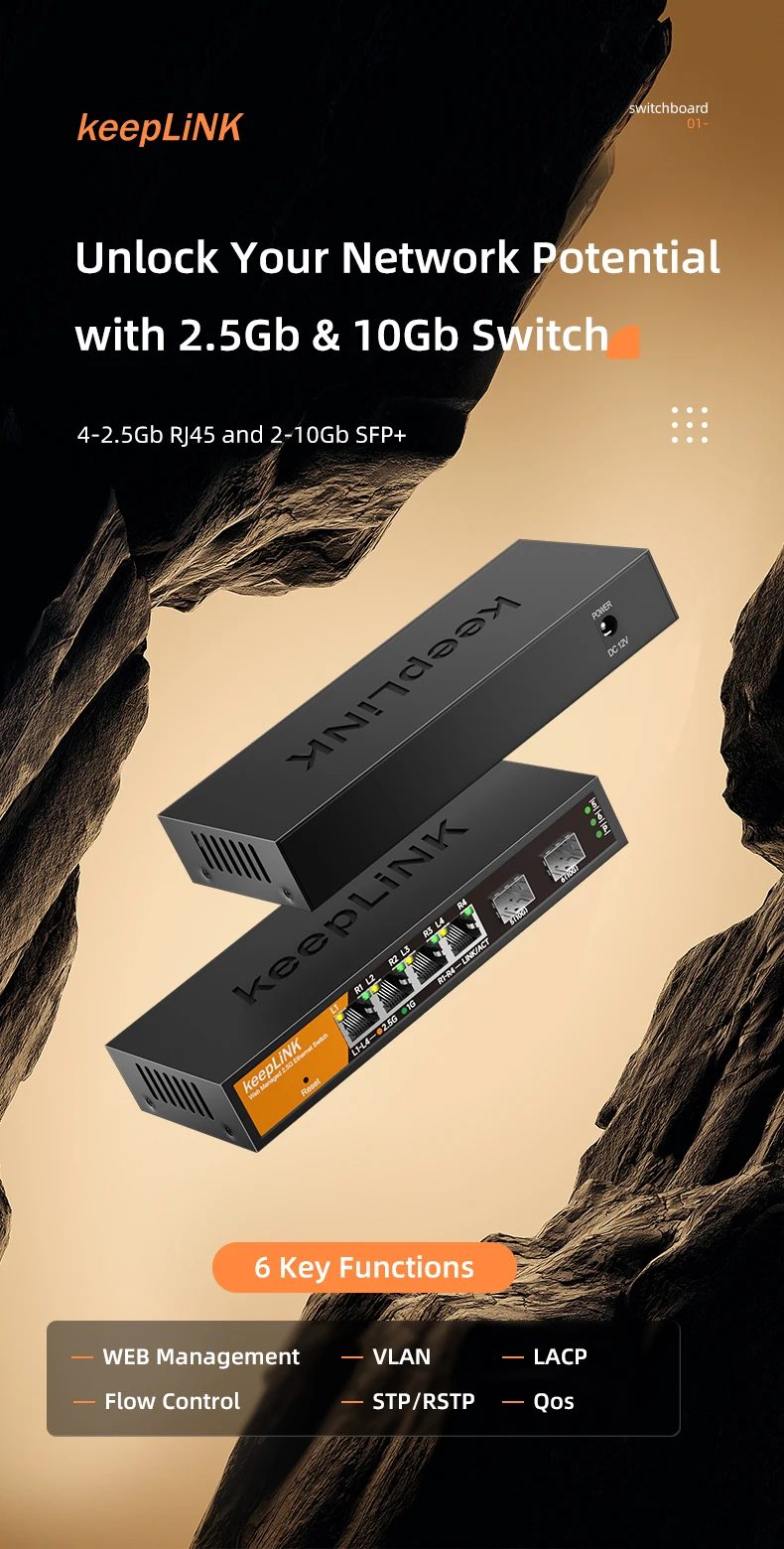 The KeepLink 6-port Multi-Gigabit managed Switch, KP-9000-6XHML-X2, helps businesses cost effectively expand their networks with multi-gig speeds. The KP-9000-6XHML-X2 Multi-Gigabit Ethernet switch comes with four(4) 2.5G ports and two(2) 10G SFP+ port in a metal case and can be placed on a desk or mounted on a wall with the included wall-mount kit. This switch is energy efficient, built to last, and rigorously tested to provide the reliability businesses need. 802.1p traffic prioritization and jumbo frame support allow for seamless integration with more sophisticated networks.
