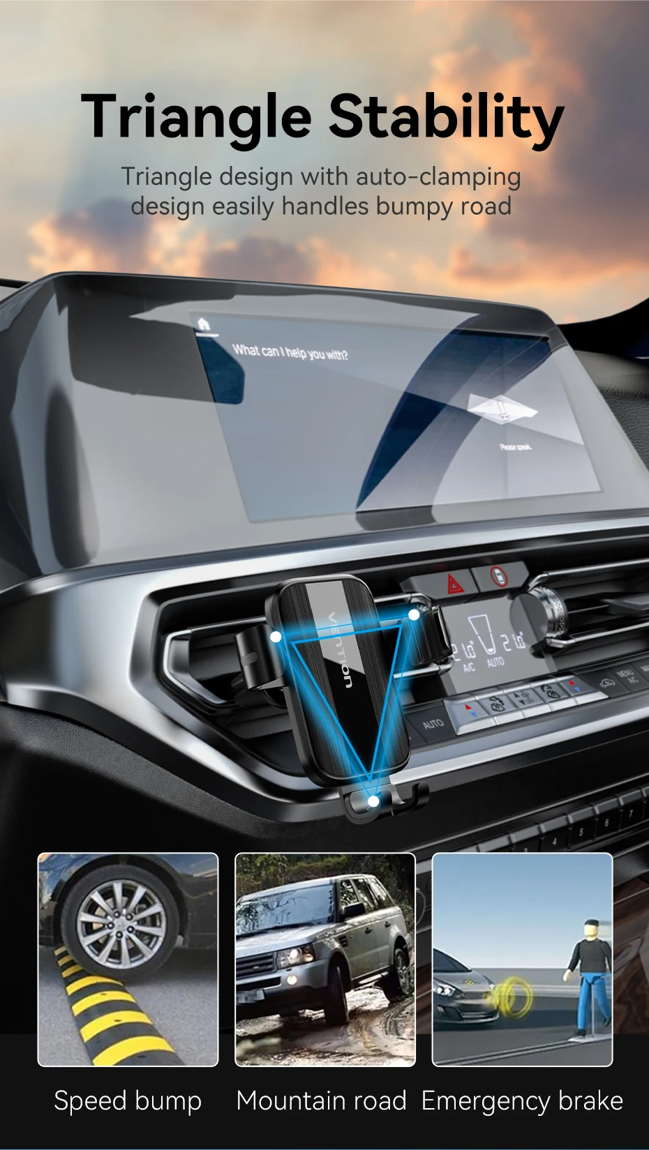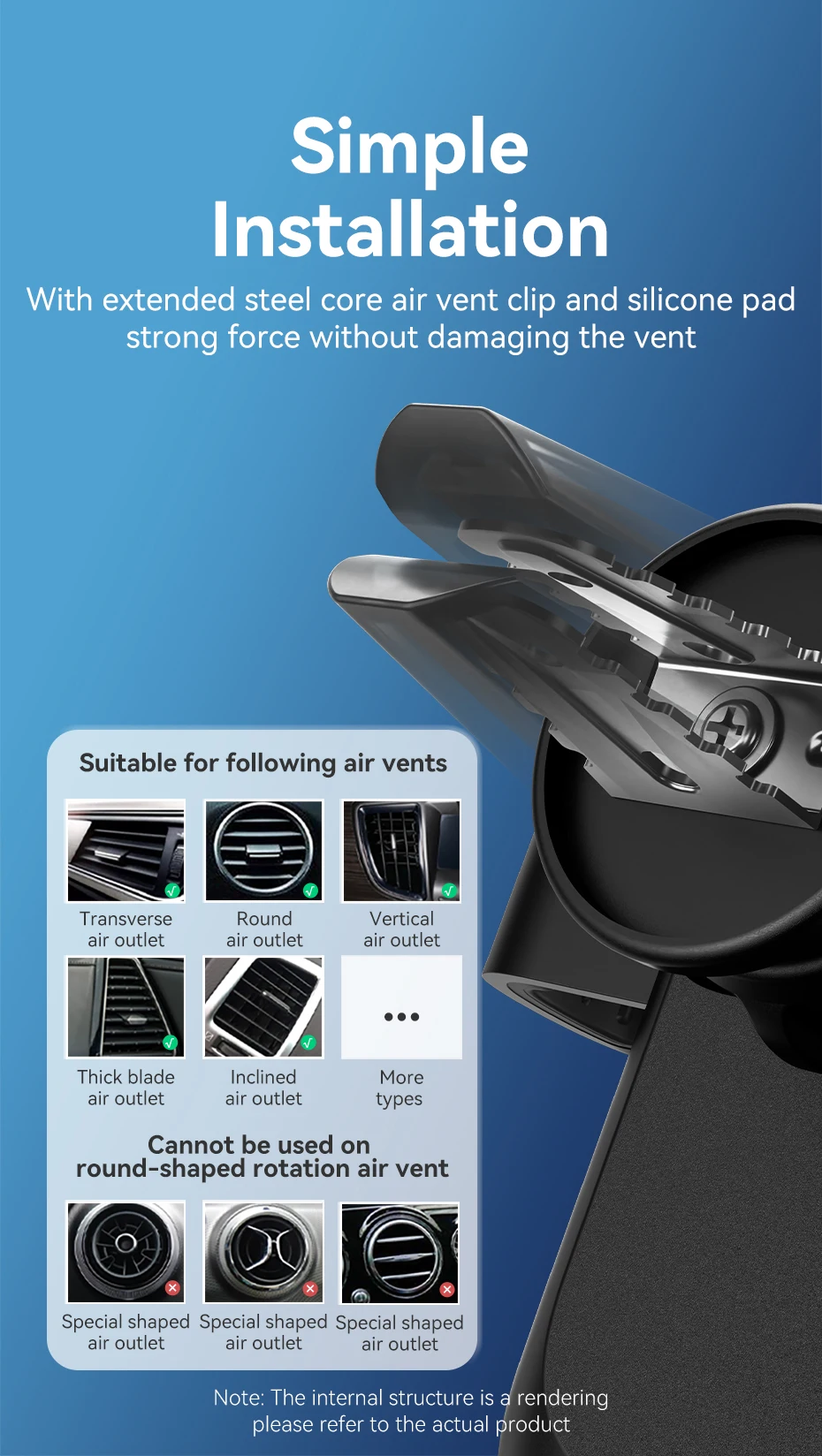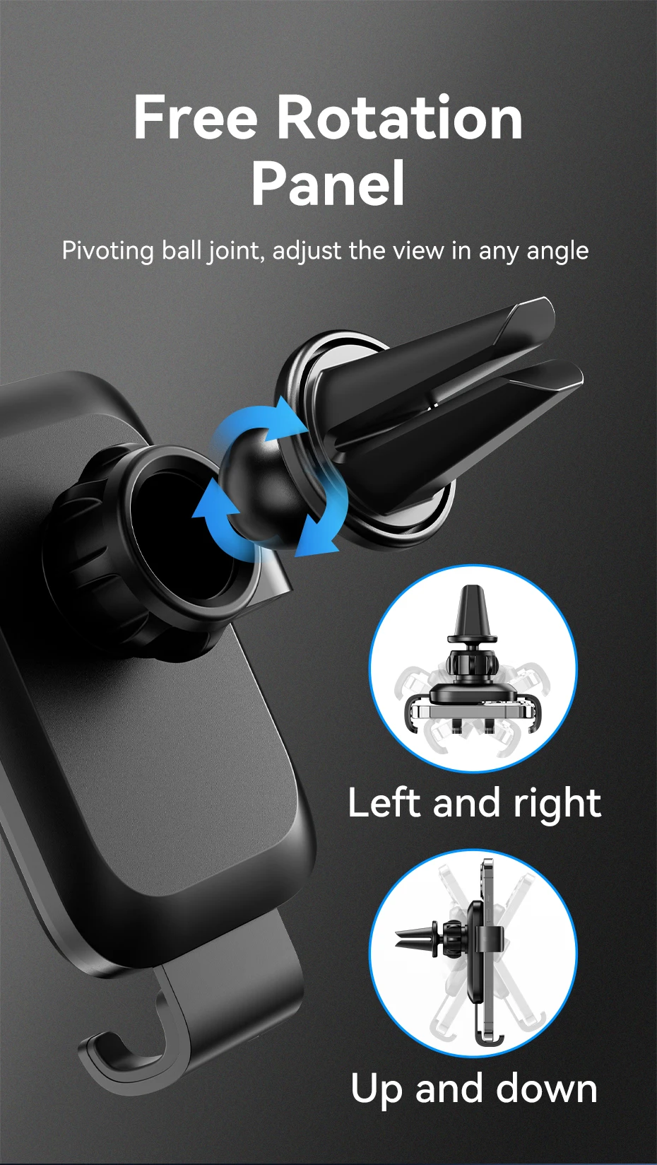 Features: Gravity linkage invisible bracket, multi-point fixed, no shaking; One-word shape, compact size, does not block the air conditioning hole; Reserve charging cable hole, do not block plug; Tail clamp silicone, does not damage the air outlet baffle;