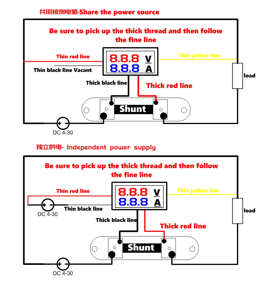 Note: The meter with a range of 50A or 100A must be connected to the shunt to measure the current no matter whether the measured current is less than 10A! Otherwise it cannot work. And our product doesn't include the shunt; you must buy separately.