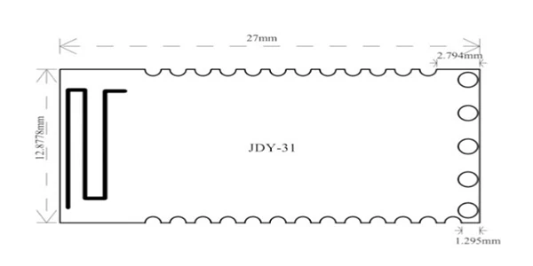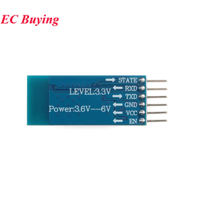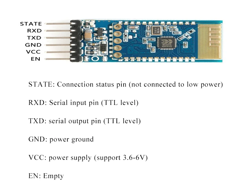 Parámetros del producto:Modelo: JDY-31Versión compatible con Bluetooth: compatible con Bluetooth 3.0 SPPBanda de frecuencia de trabajo: 2.4GHZInterfaz de comunicación: UARTTemperatura de conexión STM: 260 gradosVoltaje de funcionamiento: 1,83,6 V (se recomienda 3,3 V)Corriente de funcionamiento no conectada: 4.7 mATemperatura de trabajo: -40~80 gradosCorriente después de la conexión BLE: 7,3 mAAntena: Antena PCB incorporadaPotencia de transmisión: 8 dB (máx.)Alta distancia de transmisión: 30 metrosSensibilidad de recepción: -97dbmSoporte maestro-esclavo: esclavoRendimiento máximo SPP: 16K bytes/s (para Android, Windows)Parche de soporte JDY-31 y cabezal de pin de soldadura1.Aplicación del pasador de aguja: la especificación del cabezal del pasador es un cabezal de pasador de paso estándar de 2,54, solo es necesario soldar 5 orificios para pasadores en el módulo.2.Aplicación SMD: Generalmente, solo es necesario conectar cuatro pines de VCC, GND, RXD y TXD.Si necesita desconectarse activamente en el estado de conexión, envíe AT+DISC en el estado de conexión.1.Chip JDY-312. Módulo JDY-31 de 4 y 6 pines