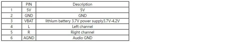 2.Salida de audio: el auricular se puede conectar directamente a la interfaz de audio de 3,5 mm o se puede conectar a la entrada de audio de la placa del amplificador de potencia (la interfaz L/R/AGND como se muestra en la imagen se puede conectar directamente).