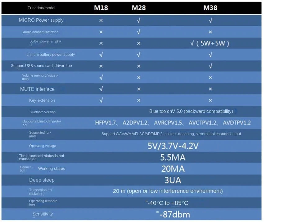 Este producto M38 para un esquema de diseño compatible con Bluetooth de baja potencia, admite nuevo compatible con Bluetooth 5.0 transmisión, reproducción estéreo sin pérdidas de doble canal, módulo conectado a compatible con Bluetooth, puede lograr rápidamente una transmisión inalámbrica compatible con Bluetooth, muy conveniente.En entornos abiertos, la distancia de conexión compatible con Bluetooth puede ser de hasta 20 metros.