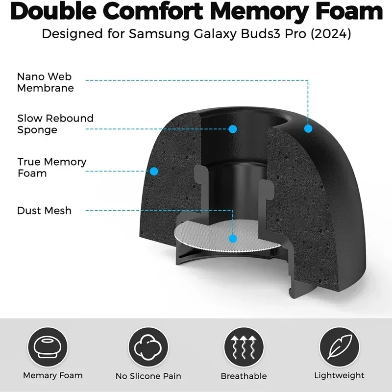 [Fácil de usar]: Simplemente conecte los auriculares al Galaxy Buds3 Pro y úselos cómodamente.El material esponjoso se expandirá suavemente dentro de la oreja, asegurando que se use firmemente durante los deportes o el ejercicio.