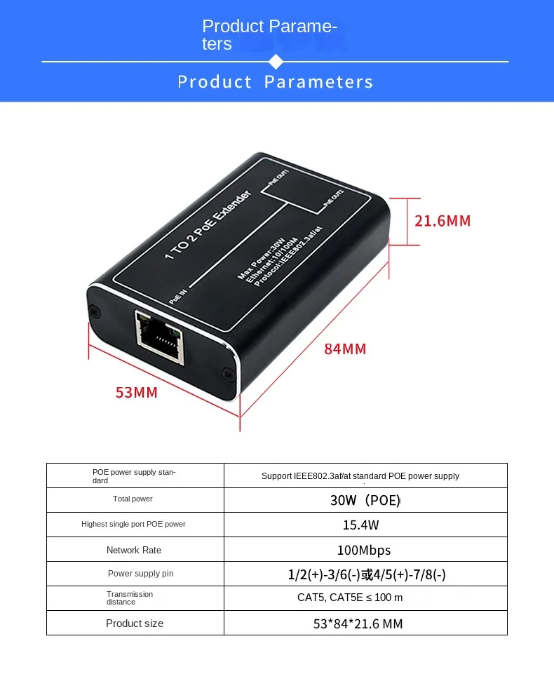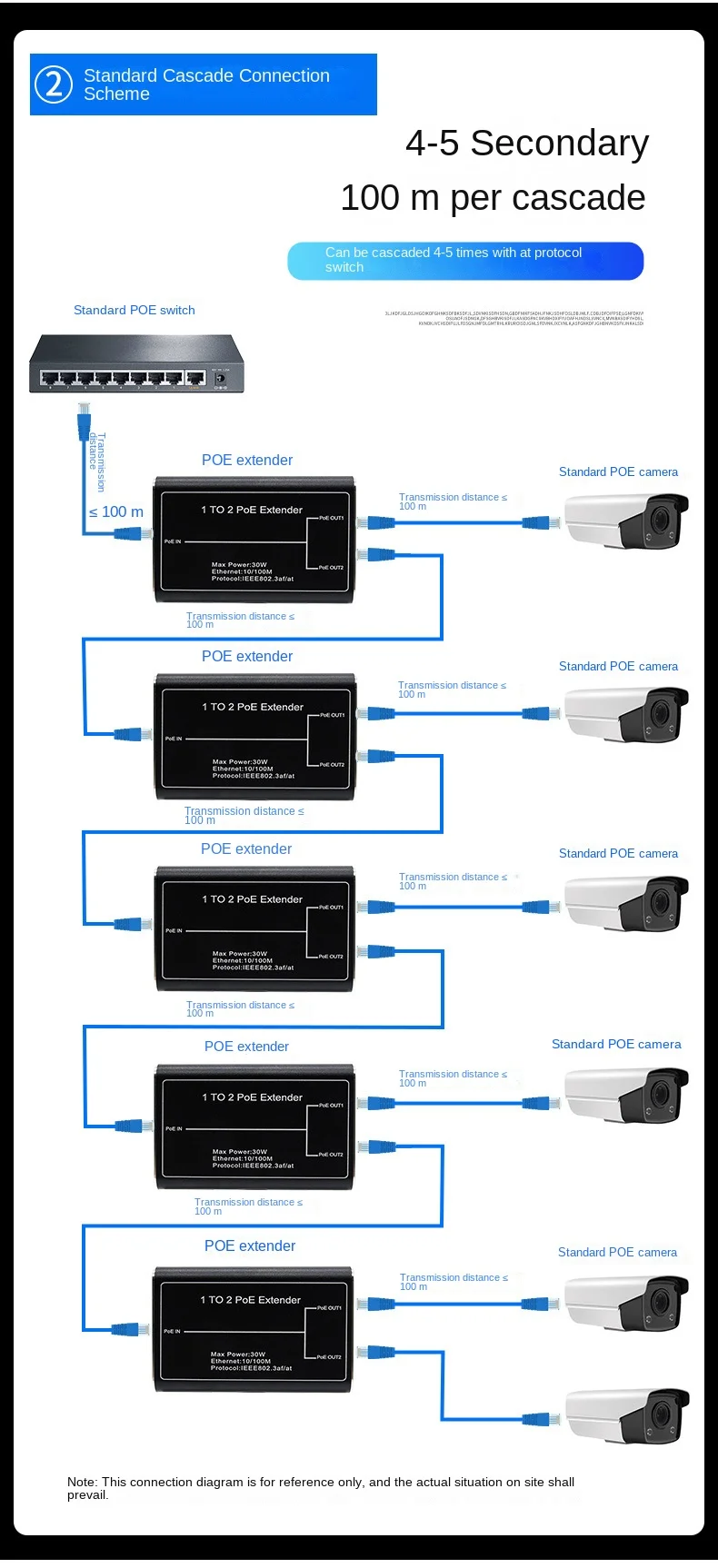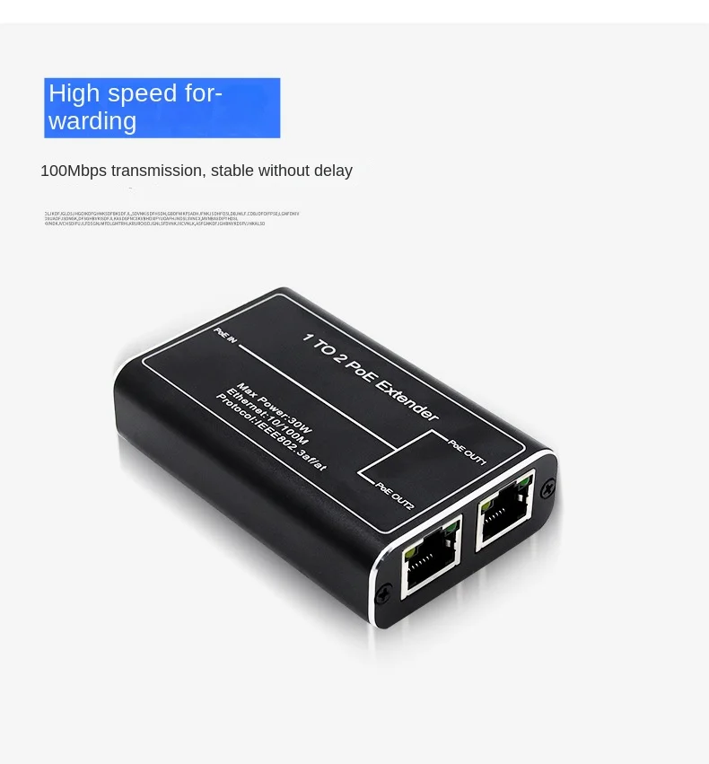 1 a 2 IEEE 802.3af/at PoE+ Repetidor POE estándar de 100Mbps Extensor de 200m 30W