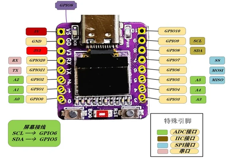 La placa de desarrollo OLED ESP32C3 está diseñada y fabricada sobre la base de ESP32C3FN4/FH4.Tiene un flash incorporado de 4M, WiFi y modos Blemodes, una antena de cerámica a bordo, una pantalla OLED de 0,42 pulgadas y soporte para descarga USB.