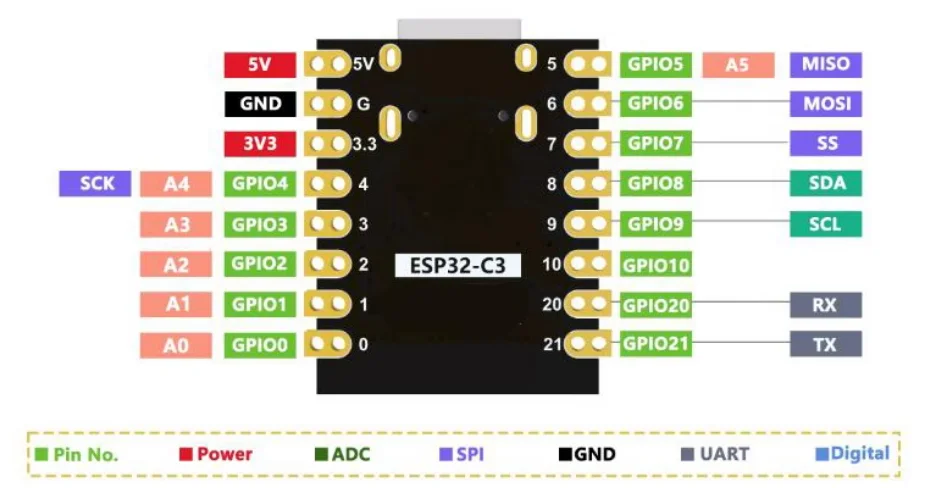 CPU: procesador de un solo núcleo ESP32-C3, RISC-V de 32 bits, que funciona a una frecuencia de hasta 160 MHz, WiFi: protocolo 802.11b/g/n, 2,4 GHz, admite modo Estación, modo SoftAP, modo SoftAP+Station, modo híbrido
