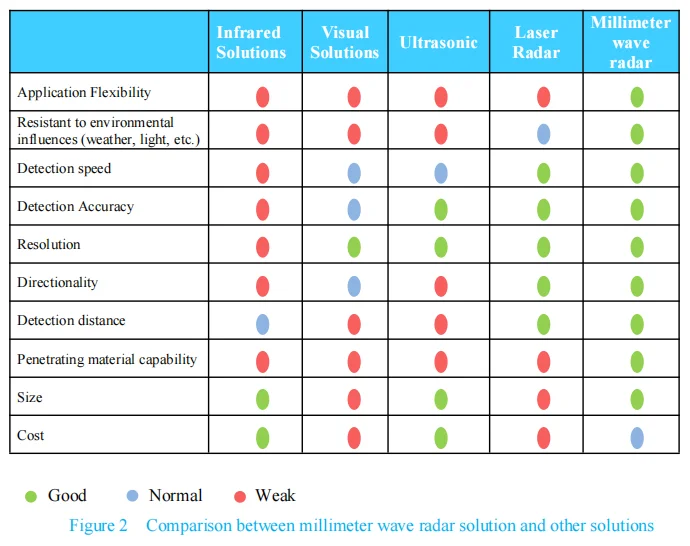 LD2410 human body sensing module adopts 24GHz millimeter wave radar sensor technology. Compared with other solutions, it has obvious advantages in human body sensing applications: