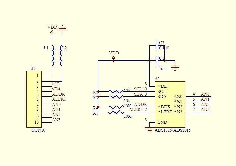 El chip es bastante pequeño, por lo que viene en una placa de conexión con ferrites para mantener silenciosos AVDD y AGND.La interfaz se realiza a través de I2C.La dirección se puede cambiar a una de las cuatro opciones (consulte la tabla de datos 5) para que pueda tener hasta 4 ADS1115 conectados en un único bus I2C de 2 cables para 16 entradas de un solo extremo.