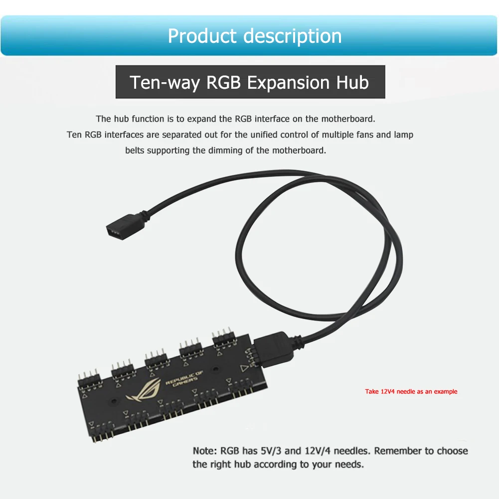 2.El concentrador de expansión RGB de diez vías de 12 V y 4 pines está conectado a la interfaz RGB de 4 pines de la placa base de la computadora, la fuente de alimentación realiza simultáneamente la sincronización de la luz RGB, 5 V y 3 pines está conectado a la interfaz RGB de 3 pines de la placa base de la computadora.