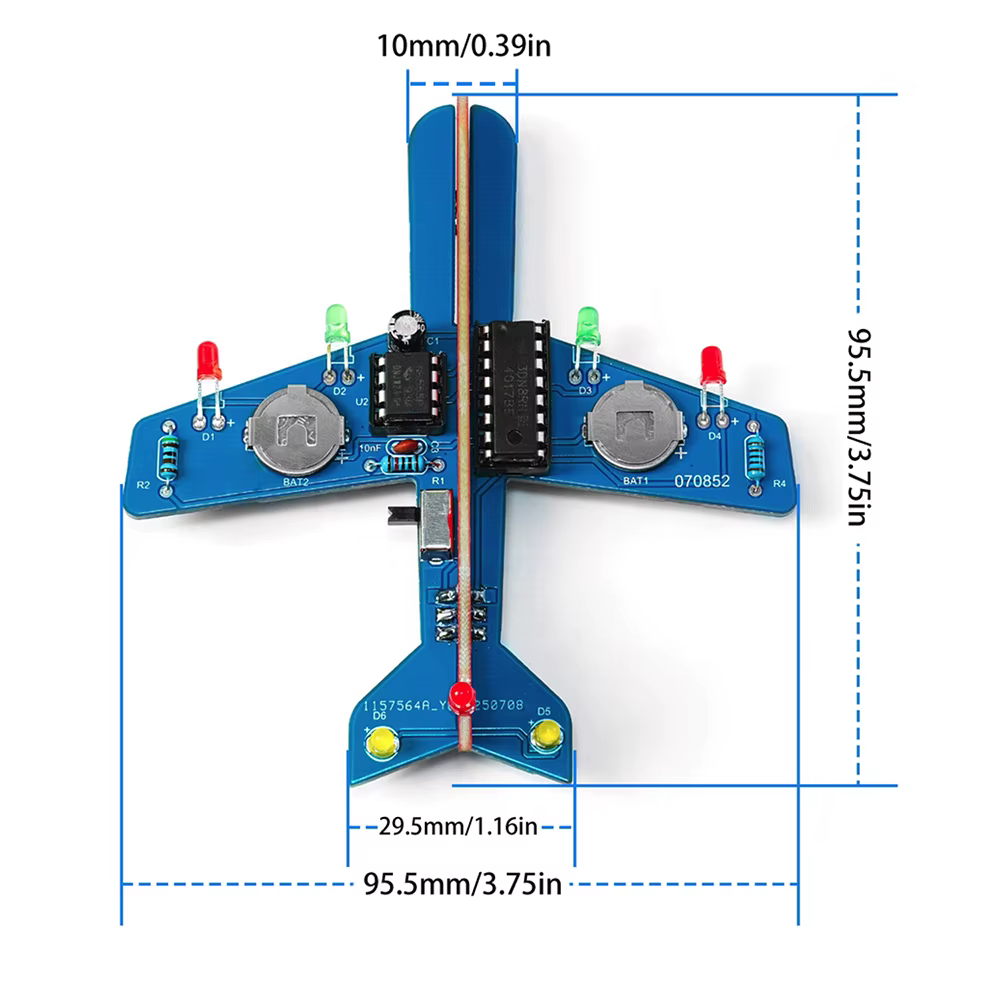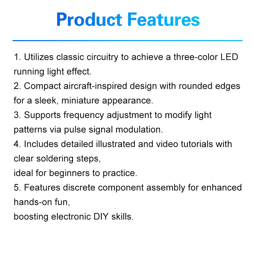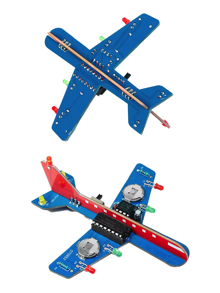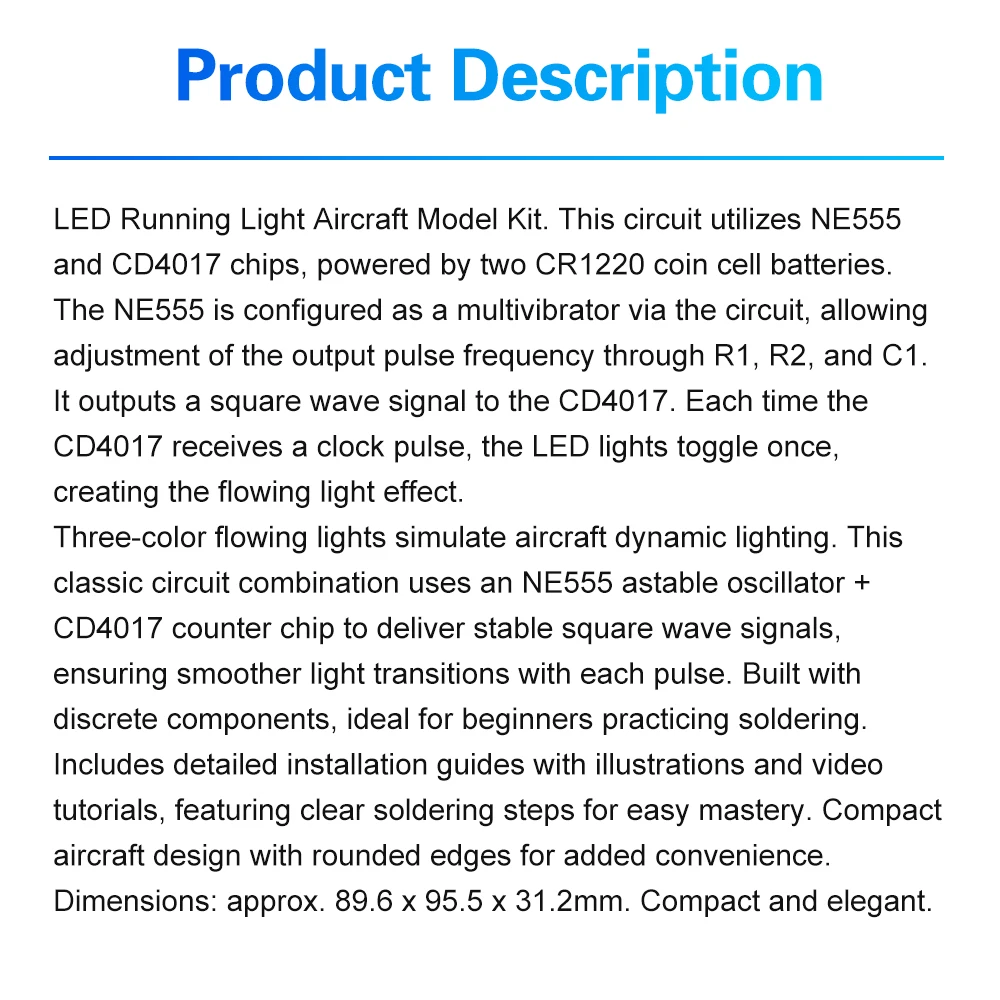 Luz que fluye de tres colores, que simula la iluminación dinámica de la aeronave, combinación de circuitos clásicos, usando oscilador multiarmónico NE555 + chip contador CD4017, señal de onda cuadrada de salida estable, cada pulso hace que el cambio de luz sea más suave.Al adoptar componentes discretos, adecuados para la práctica de soldadura novatos, equipados con gráficos de instalación detallados y tutoriales en video, los pasos de soldadura son claros y fáciles de comenzar para los principiantes.El avión pequeño tiene bordes y esquinas redondeados, lo cual es más considerado.El tamaño del cuerpo es de aproximadamente 89,6 * 95,5 * 31,2 mm, compacto y exquisito.