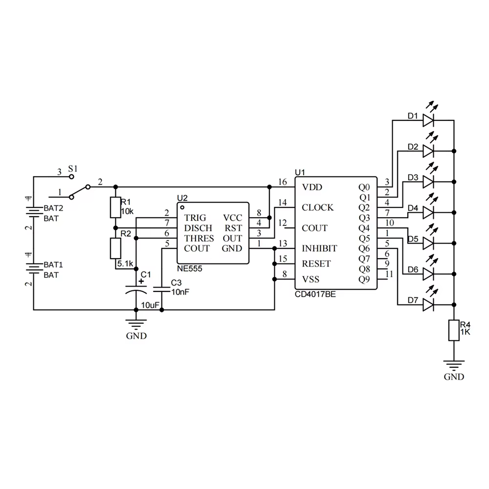 El kit de modelo de avión con luz de flujo LED se compone de chips NE555+CD4017 y funciona con dos pilas de botón CR1220.El NE555 está configurado como un oscilador multiarmónico a través del circuito, y la frecuencia del pulso de salida se puede cambiar a través de R1, R2, C1 para emitir una señal de onda cuadrada a CD4017.Cuando el CD4017 recibe un pulso de reloj, la luz LED cambia una vez, logrando así el efecto de una luz de flujo.