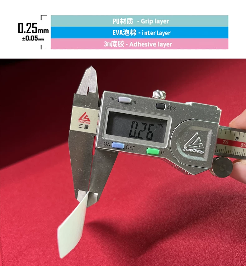 2.El ticker antideslizante está hecho de cuero personalizado y la capa intermedia está hecha de poliuretano.El material se caracteriza por un espesor fino, la parte más delgada puede alcanzar los 0,25 mm y la sensación de la superficie tiene cierta viscosidad y la sensación es ligeramente esmerilada.