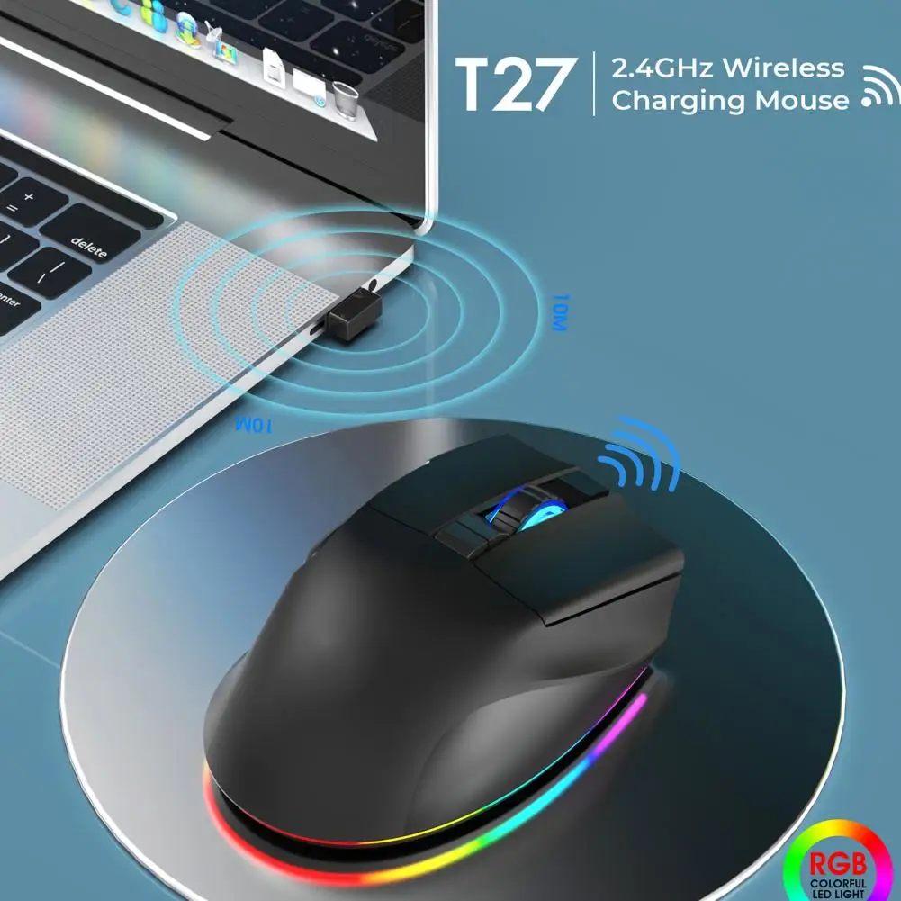 El ratón inalámbrico tiene un diseño ergonómico, que no causará cansancio ni estrés en la mano después de un uso prolongado. Tiene 11 efectos de iluminación, incluyendo carreras de caballos, respiración y luz constante.