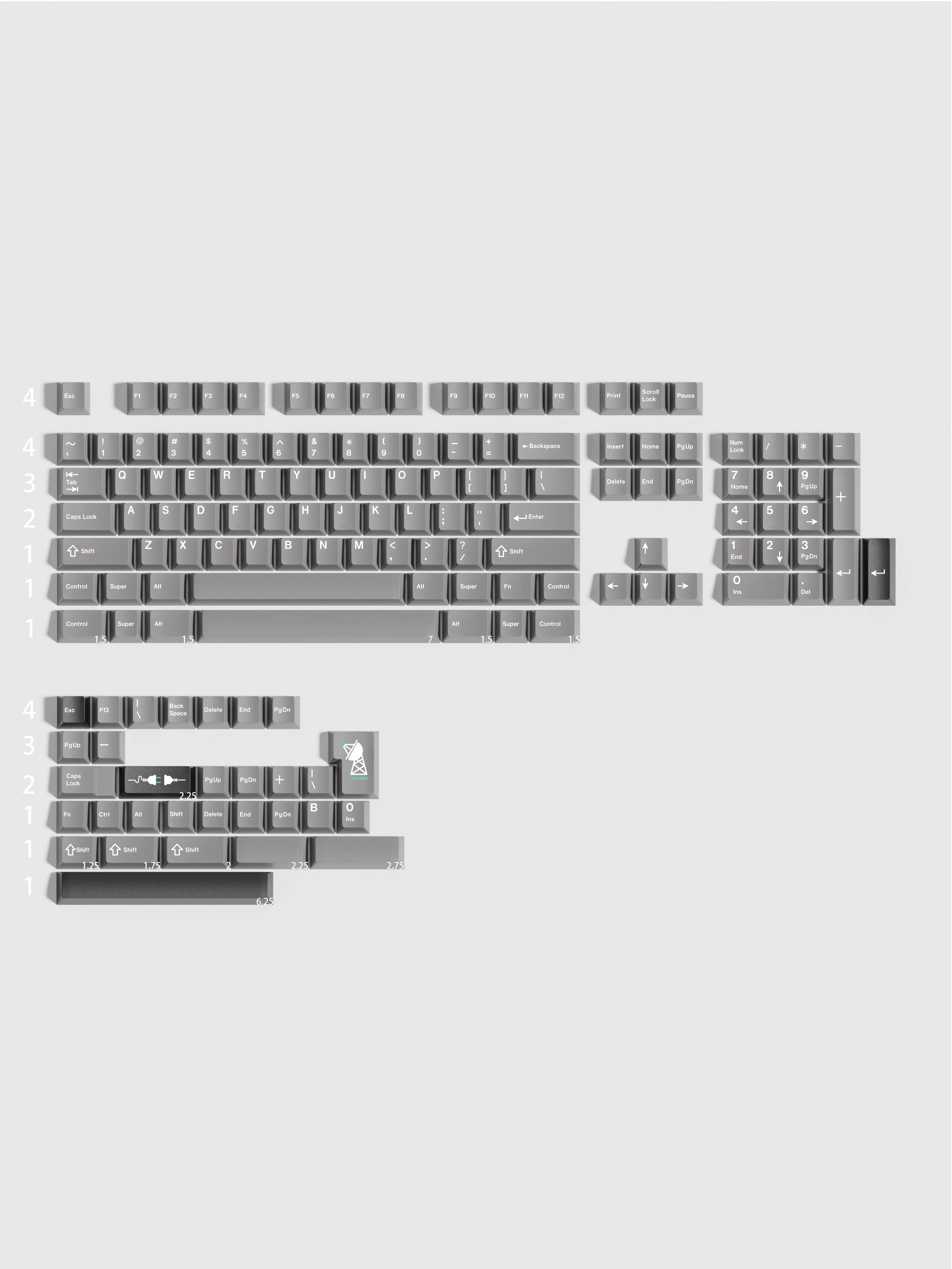 El kit base es de 143 teclas, incluye 1.75U, cambio 2U, 1.5U ctrl alt, ISO Enter y 2.25U, 2.75U, 6.25U, 7U Barra espaciadora, doble B, es compatible con 61 、 63 64 、 teclado mecánico 65 67 68 、 80 84 、 87 、 96 、 980 、 104 、 108, etc. con interruptores MX