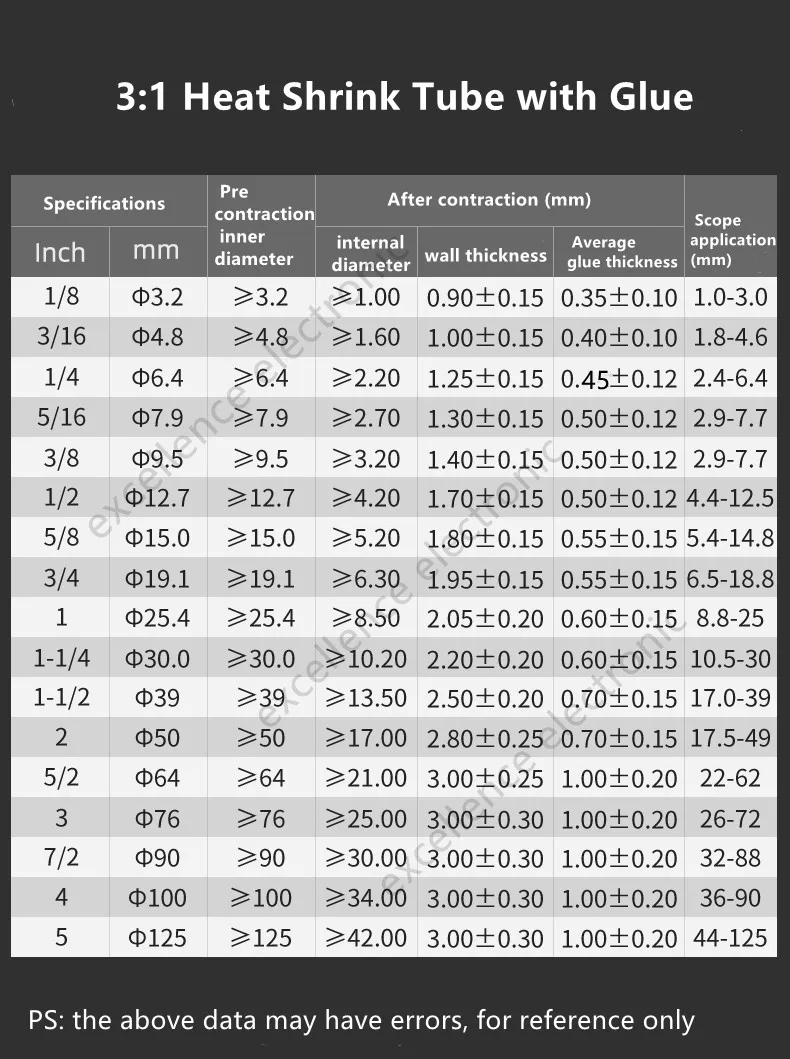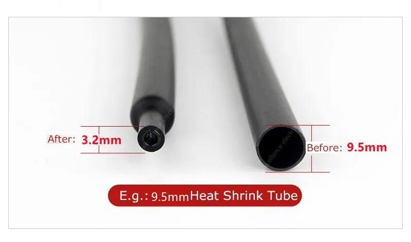 Tubo Termocontraíble de 1 m/lote 3:1 con pegamento doble diámetro de la tubería de pared 2,4/3,2/4,8/6,4/7,9/9,5/12,7mm Nota: Puede haber una diferencia de 1-3mm debido a la medición manual. Datos y fotos solo como referencia El diámetro del tubo Termocontraíble es el diámetro interior. Tubo de doble pared características: (1) Relación de contracción 3:1, adecuada para el aislamiento y sellado de formas irregulares. (2) espesor de pared medio, a la vez que se mantiene la flexibilidad, mayor resistencia a la protección mecánica. (3) la capa adhesiva se puede unir al plástico, al caucho y al metal. (4) la temperatura de contracción inicial es de 70 °C, y la temperatura de contracción total es de 125 °C. (5) temperatura de fusión de la capa interna: 70 C -100 C; (6) Rango de temperatura de funcionamiento: -40 °C ~ 125 °C
