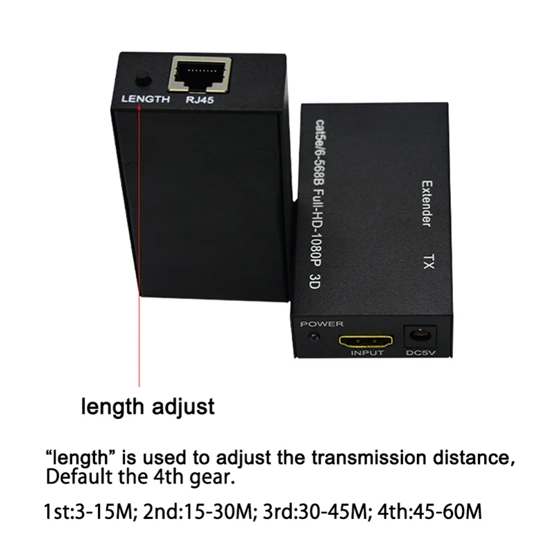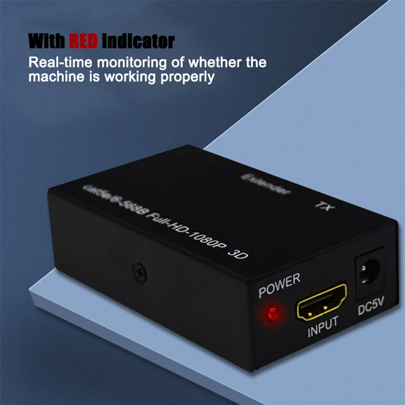 Característica: 1.Nombre: extensor de 60M compatible con HDMI sobre un solo cable Ethernet 2.Carcasa: Metal de primera calidad 3.Resolución: 1920*1080P 4.Velocidad: 1,65 Gbp 5.Puerto: compatible con HDMI + CC + RJ45 NOTA: La distancia máxima de 60 M necesita un cable CAT6