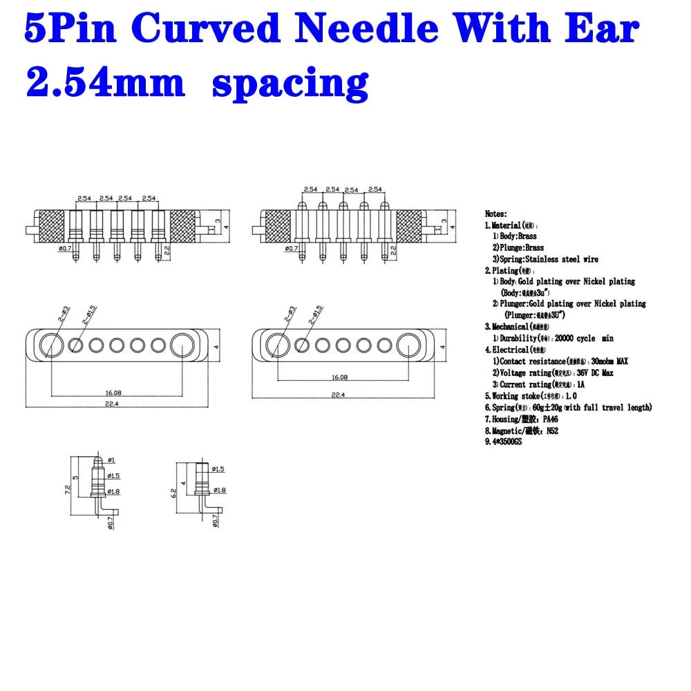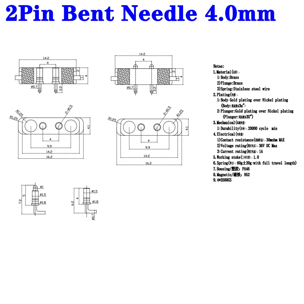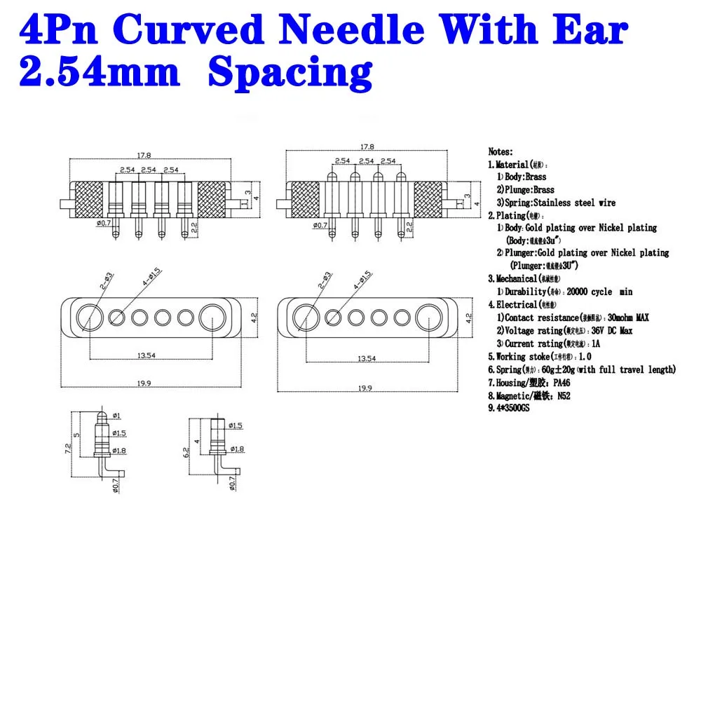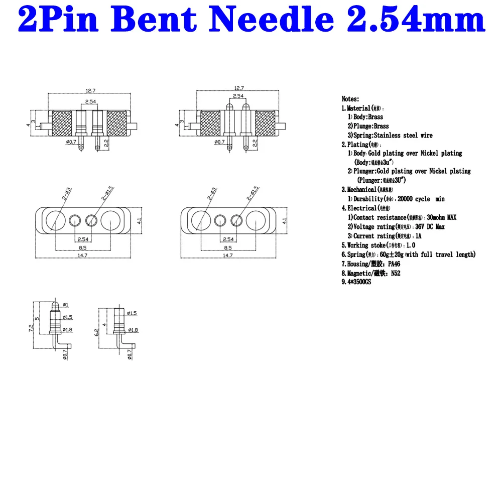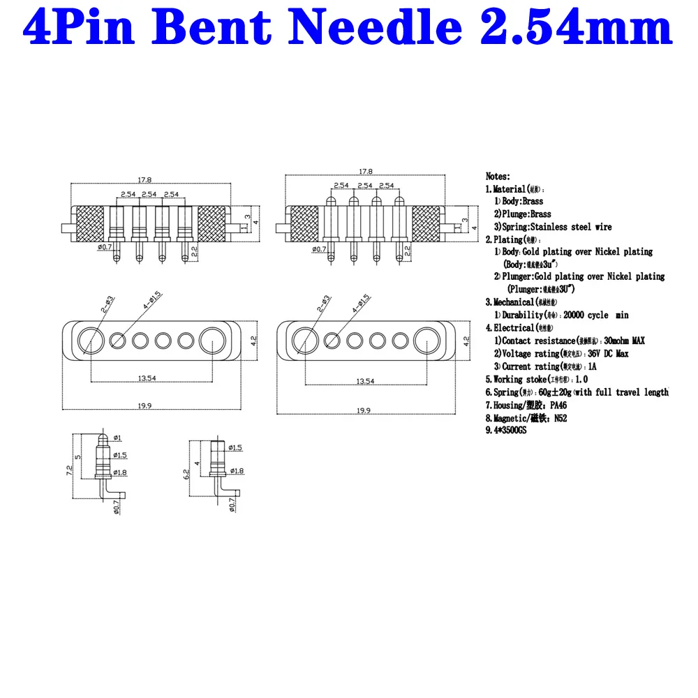 1 par de agujas dobladas DC 36V 1A, conector de Pin Pogo magnético resistente al agua, conector macho hembra de Pogopin de 10 pines, toma de corriente de resorte CC