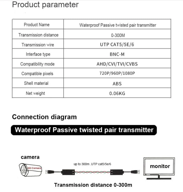 1 par AHD/CVI/TVI HD transmisor de par trenzado impermeable BNC pasivo a Cable de 2 núcleos Balun de vídeo para CCTV ABS plástico Q1