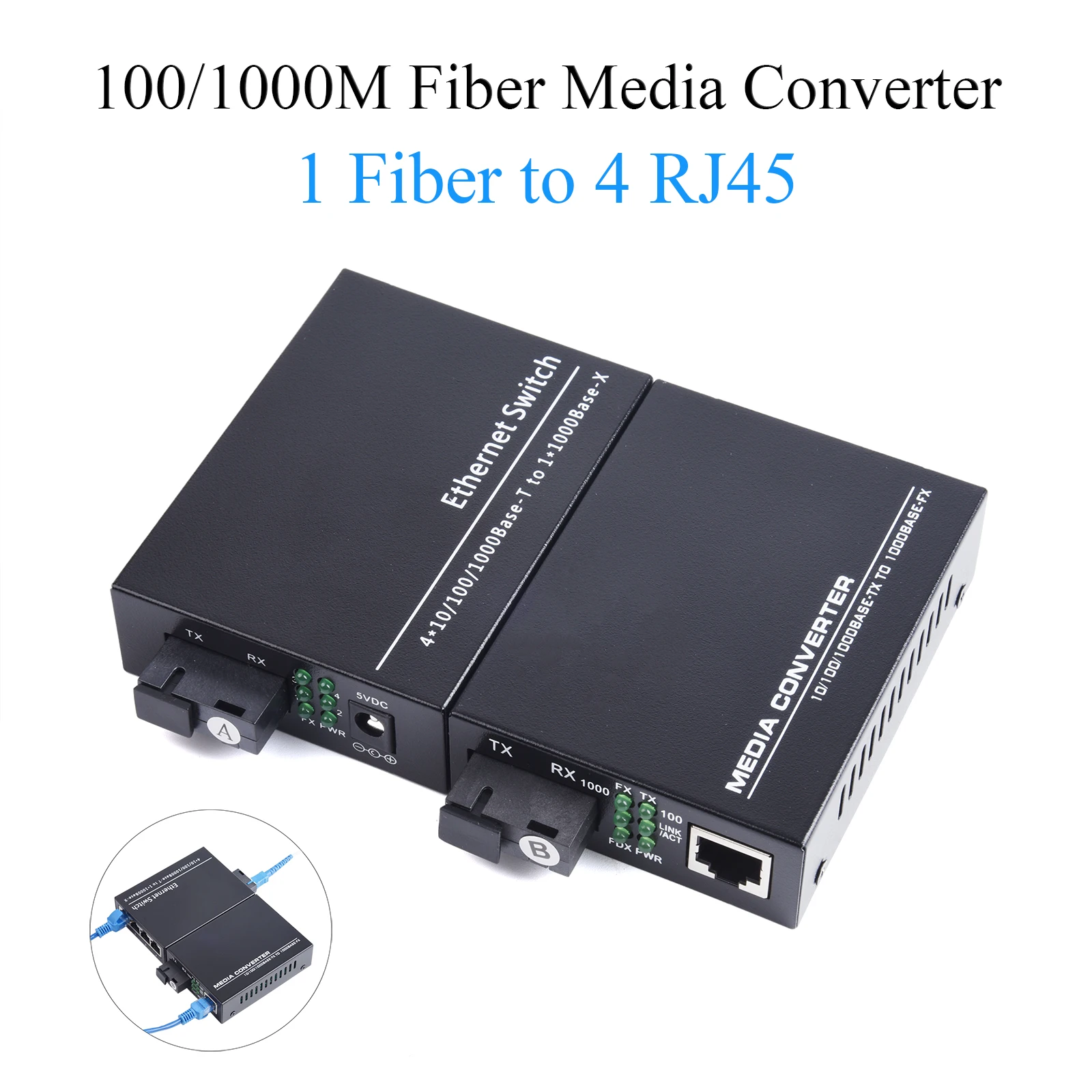 Comprar 1 par de convertidores de medios ópticos Gigabit, 10/100/1000M, modo único, 1 fibra a 4 puertos RJ45 UPC/APC SC con cable de fibra para exteriores