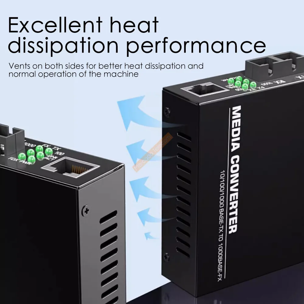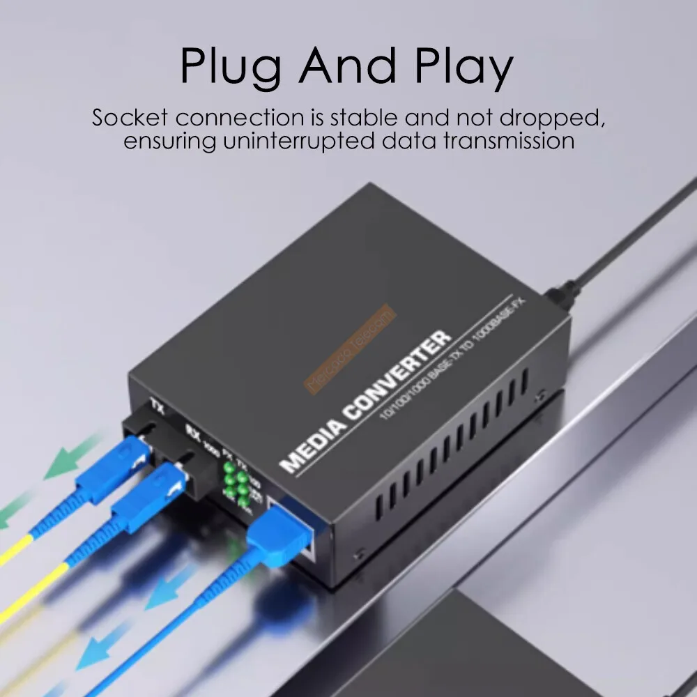 Los convertidores multimedia Gigabit Ethernet con fuente de alimentación externa están diseñados para transmitir y recibir datos de 10/100/1000 Mbps a través de fibra óptica.