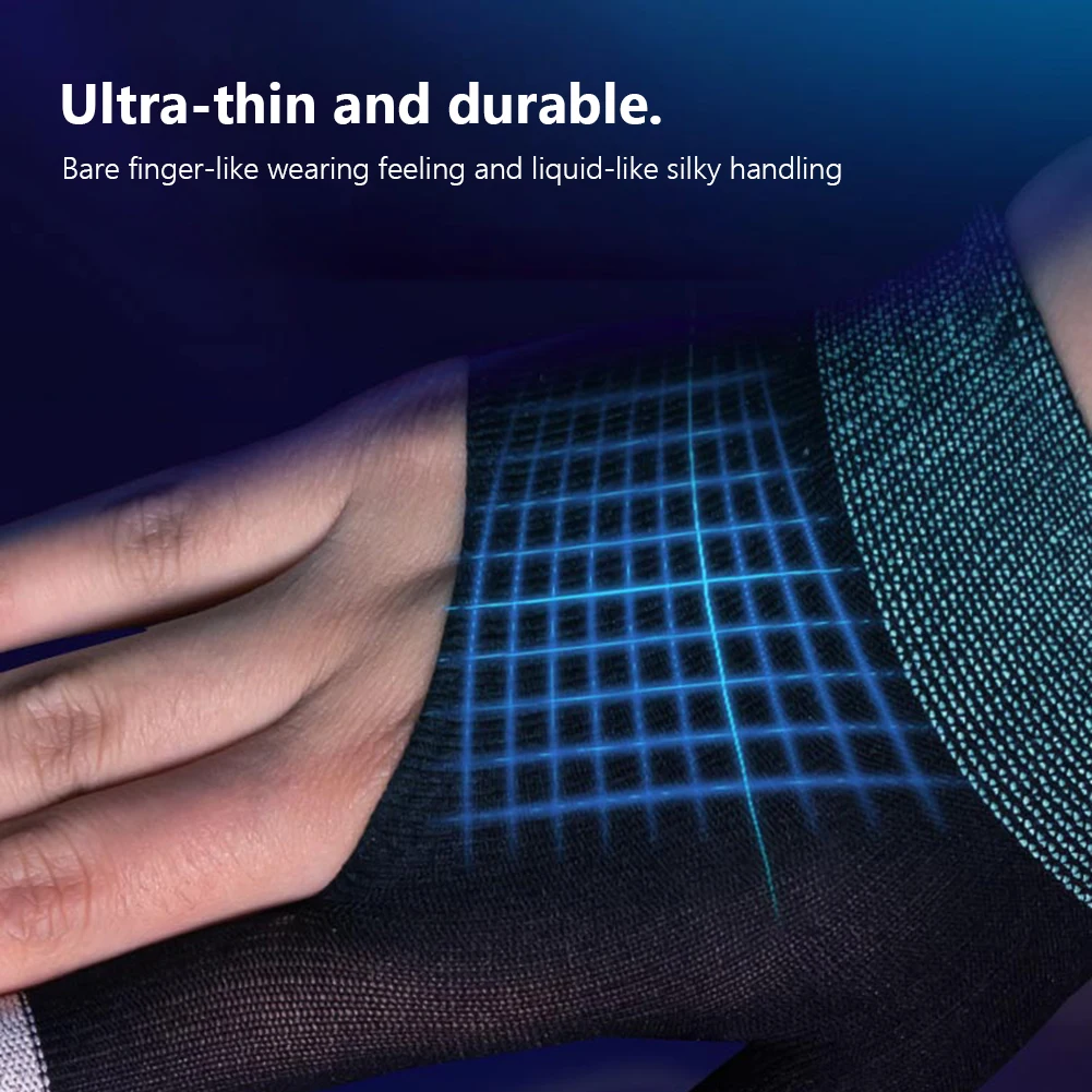 2.Ultradelgado pero:Experimenta lo más parecido a la piel desnuda con nuestros guantes con la punta de los dedos de la palma.Su construcción ultrafina permite una destreza similar a la de un líquido y al mismo tiempo proporciona resistencia para maratones de juegos prolongados.