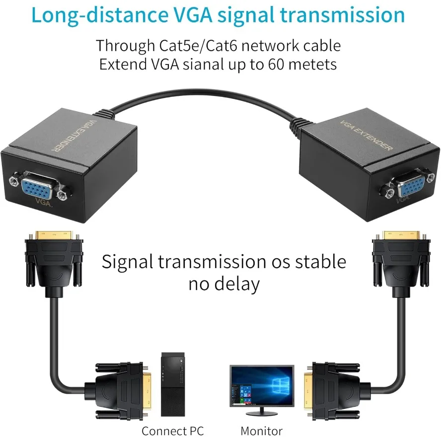 Comprar 1 par VGA a RJ45 60M extensor repetidor adaptador divisor convertidor Cat5e/6 Lan Ethernet 1080P transmisor receptor para PC portátil