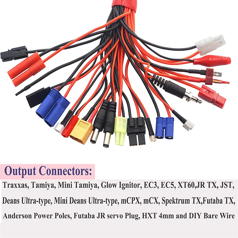 INPUT CONNECTORS: 14 AWG 4mm banana plugs. OUTPUT CONNECTORS: Traxxas(male), Tamiya(male) - Large, EC3(male), JST(female), Futaba(female), XT90(male), T-Dean(male), DIY Bare Wire