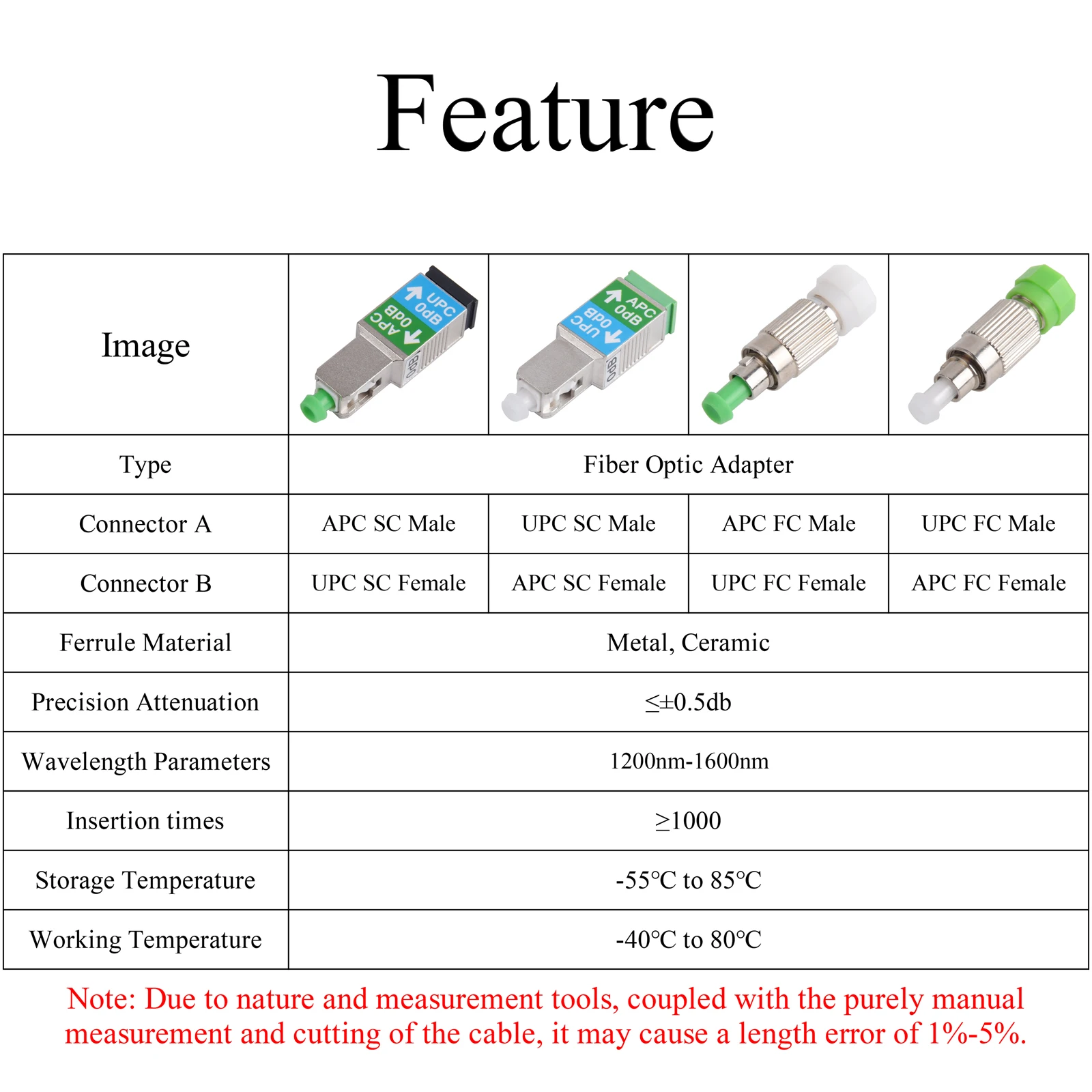 Adaptador de Fibra Óptica APC/UPC SC FC Macho a APC/UPC SC FC Hembra 0dB Atenuador Monomodo 1200nm-1600nm Convertidor Conector de Fibra, 1 ", 1"