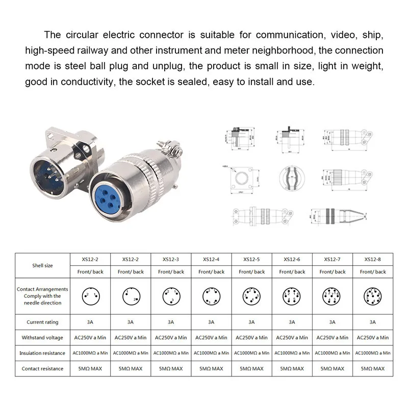 XS12 Adecuado para instrumentos y medidores, conexión eléctrica entre dispositivos electrónicos, aplicado a equipos marinos y de aviación. Computadora. Comunicación. Exploración petrolera. Navegación. Equipo antirrobo. Electrónica de tráfico y mecánica.