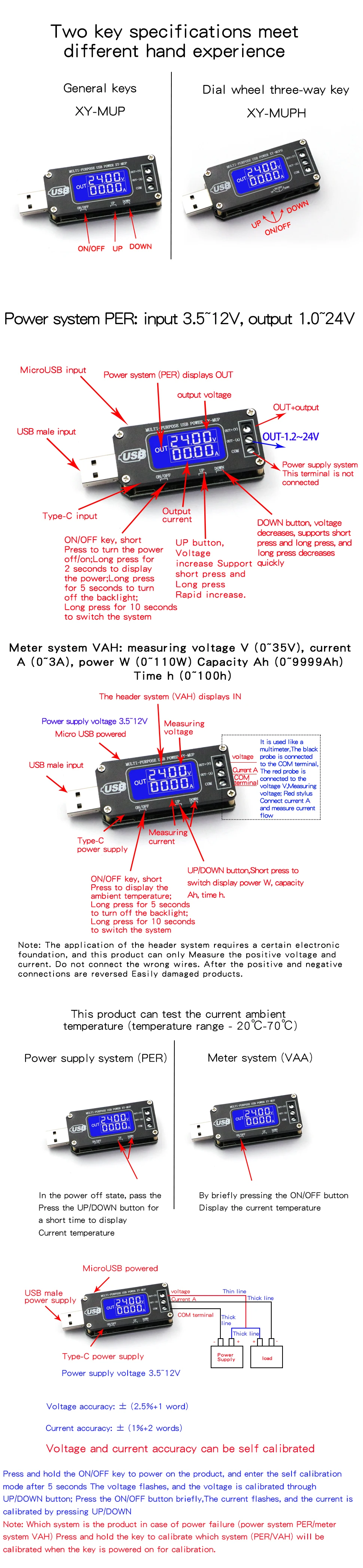 Este producto es muy cómodo de usar.Hay 2 conjuntos de sistemas.Si simplemente conecta USB, microUSB o Type-C, puede generar un voltaje ajustable de 1,0 V a 24 V a voluntad según el sistema de alimentación (PER).La potencia es de 2-3W.Debajo del sistema de cabezal medidor (VAH), puedes medir el voltaje y la corriente como un multímetro.También puedes probar la potencia, la capacidad y el tiempo.Es muy adecuado para que los ingenieros técnicos investiguen y desarrollen, depuren instrumentos e ingenieros posventa que viajen para mantenimiento; Este producto también puede medir la temperatura ambiente actual, lo cual es muy conveniente.