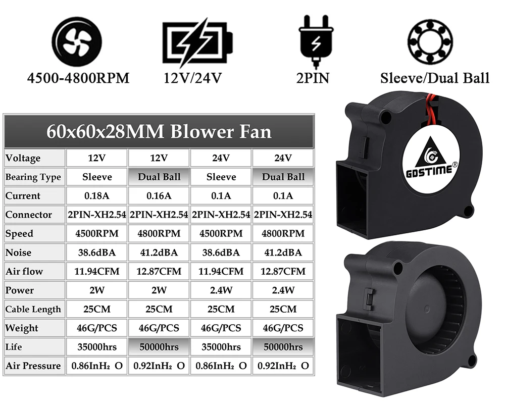 Gdstime DC 12V 24V 60mm x 28mm ventilador centrífugo 6028 doble bola