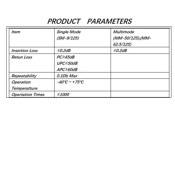 Se pueden utilizar tanto adaptadores de conector monomodo como multimodo de forma intercambiable, con calidad de telecomunicaciones, alta pérdida de retorno, baja pérdida de inserción, alta confiabilidad y alta precisión dimensional mecánica.