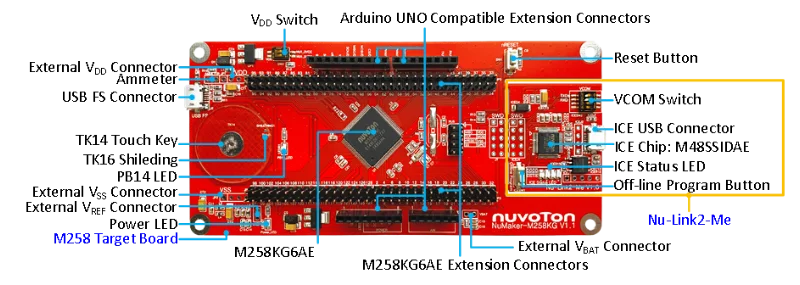 NuMaker: M258KG es la nueva placa de desarrollo del controlador tang Nu M258KG, M258SG, M258QG.Dispositivo USB de velocidad completa a la integración de estas series M258, sensores táctiles capacitivos y la tríade de la función del controlador LCD.NuMaker - M258KG consta de dos partes: la placa de destino M258 y Nu - Link2 - Yo para depurar el programador.NuMaker: M258KG se puede utilizar como plataforma de evaluación, desarrollo, validación y monitoreo del consumo de energía del proyecto.