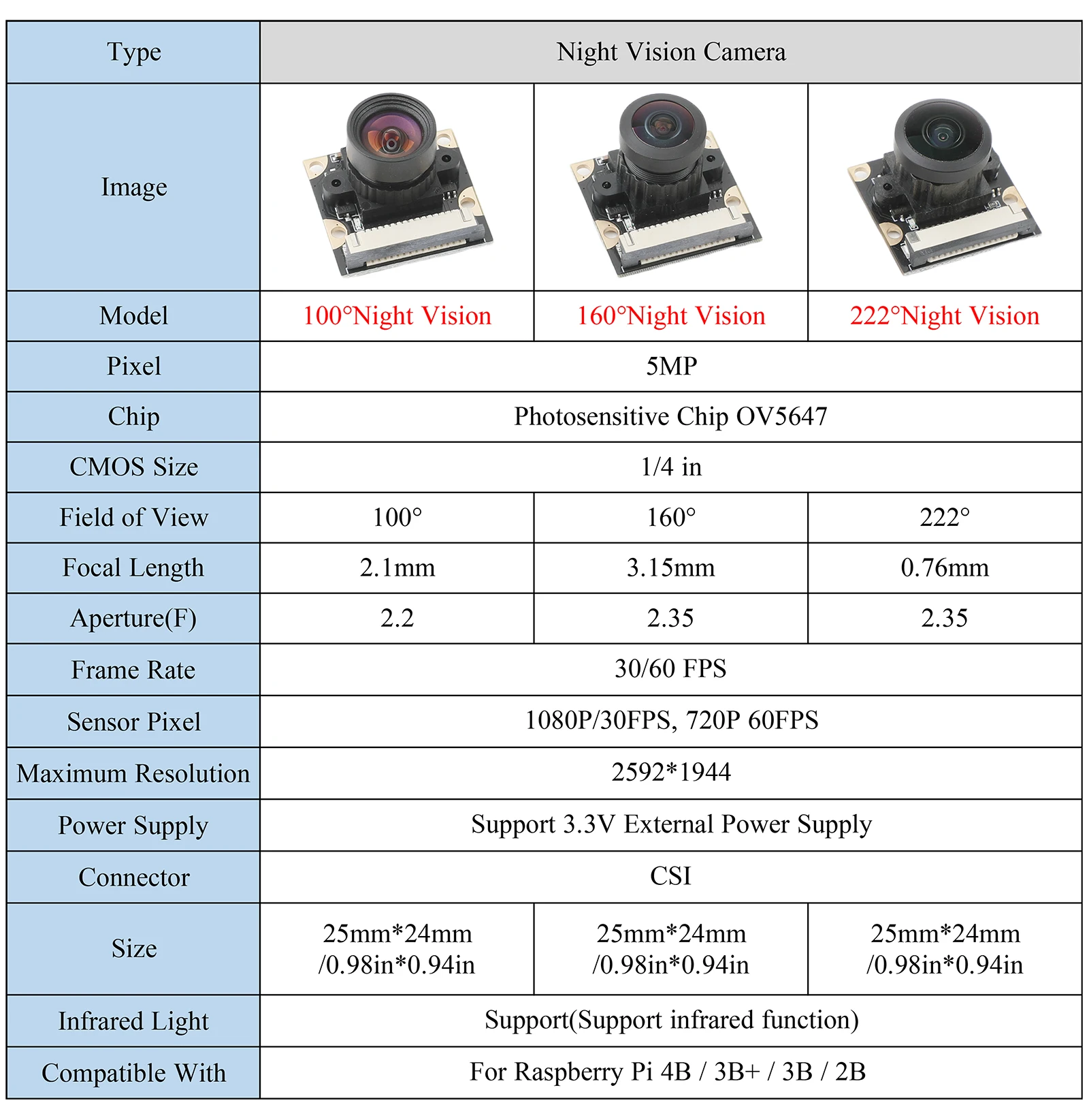 Visión diurna/noche Raspberry Pi HD 100°/160°/222° Módulo de cámara web gran angular de 5MP con luz de relleno IR para Raspberry Pi 4B/3B/2B
