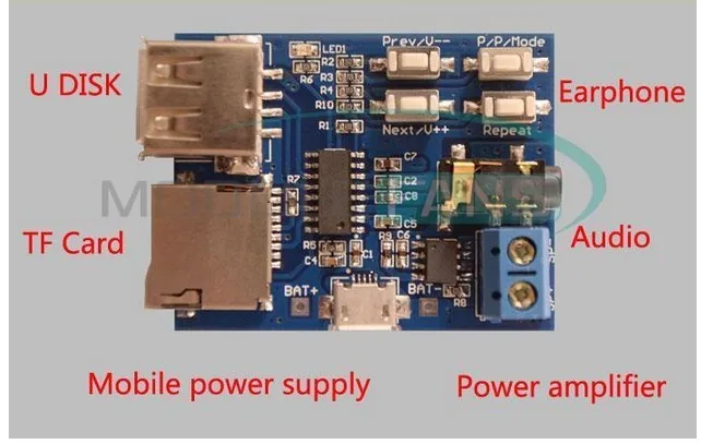 1) Support MP3 format, playing power on automatically.When mp3 is played the red LED flashes.