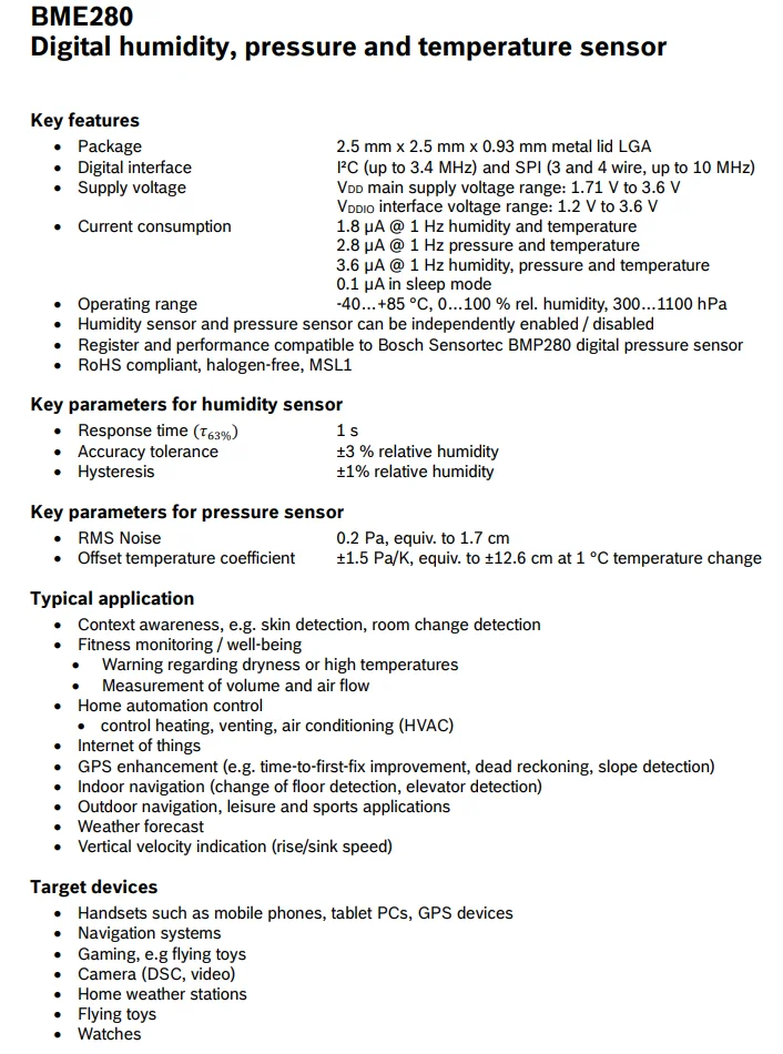 El sensor ambiental BME680 es un sensor ambiental MEMS cuatro en uno que mide cuatro parámetros: COV (compuestos orgánicos volátiles), temperatura, humedad y presión del aire, lo que lo hace ideal para monitorear la calidad del aire.Utilizando tecnología MEMS, el sensor es pequeño y consume poca energía, lo que lo hace adecuado para aplicaciones de bajo consumo como dispositivos portátiles.