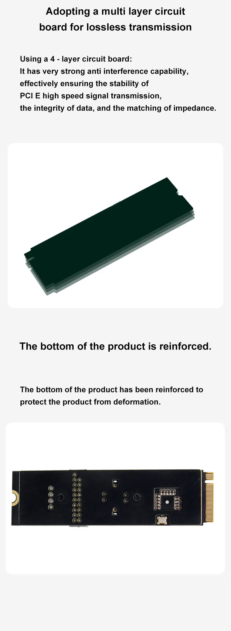 2. Association standard M.2 Mkey gold fingers; high gold plating: strong oxidation resistance, good conductivity, and wear resistance;