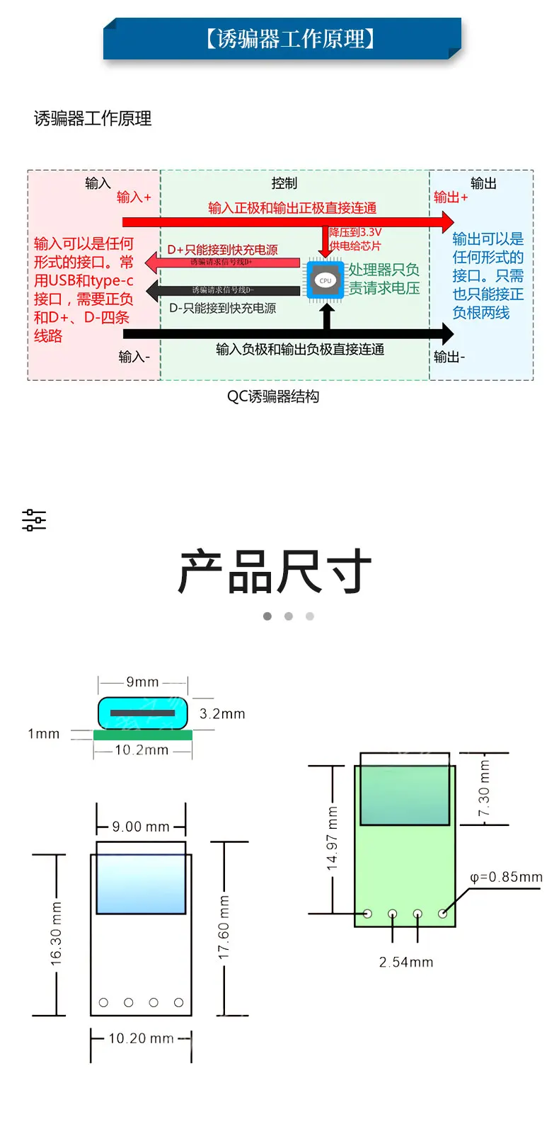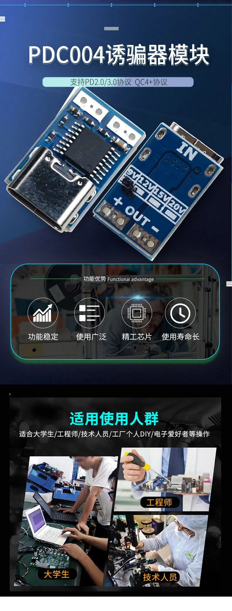 Por ejemplo, para un producto de 15V PDC004, si su fuente de alimentación PD es de solo 12V como máximo, o si no hay 15V, el siguiente nivel es 12V, y el cebo se aplicará para el siguiente nivel de 12V. El cebo PD tiene un formato de comunicación estricto. No engañará a los voltajes más altos, y sin voltaje, no aumentará ni disminuirá la salida de voltaje. No puede cambiar la potencia, el voltaje y la corriente de la fuente de alimentación.
