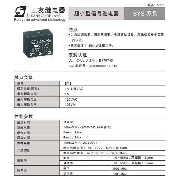 1 unids/lote SANYOU relé SYS-S-105L 5VDC SYS-S-112L 12VDC SYS-S-124L 24VDC 6PIN 1A reemplazable G5V-1-5VDC 12VDC 24VDC HFD23-012-1ZS