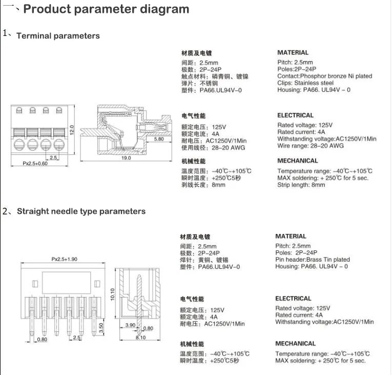 Plastic parts are made of flame retardant insulating material modified nylon PA66 (flame retardant grade: UL94, V-0), and elastic components are made of high quality stainless steel. Long service life, no corrosion, aging resistance, pressure 4KV, temperature 105 C normal work. High quality brass, phosphorus copper and steel are used for metal parts, and tin, nickel, zinc and other protective coatings are plated respectively.