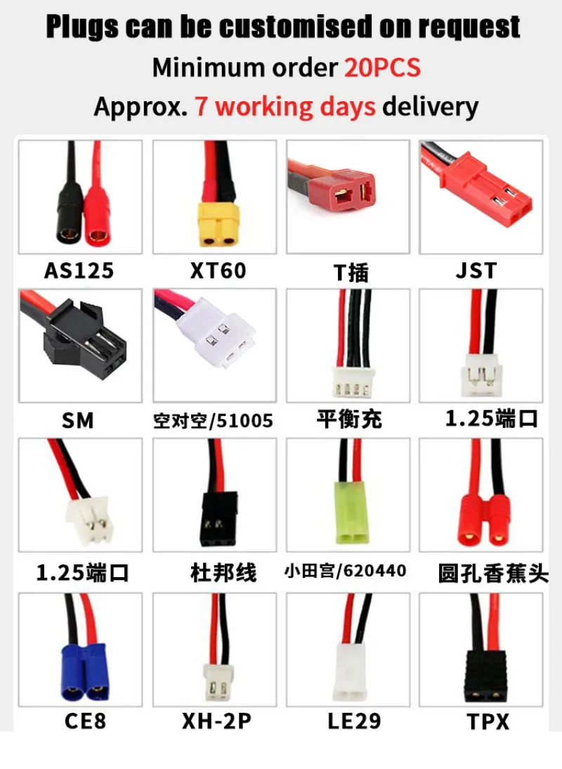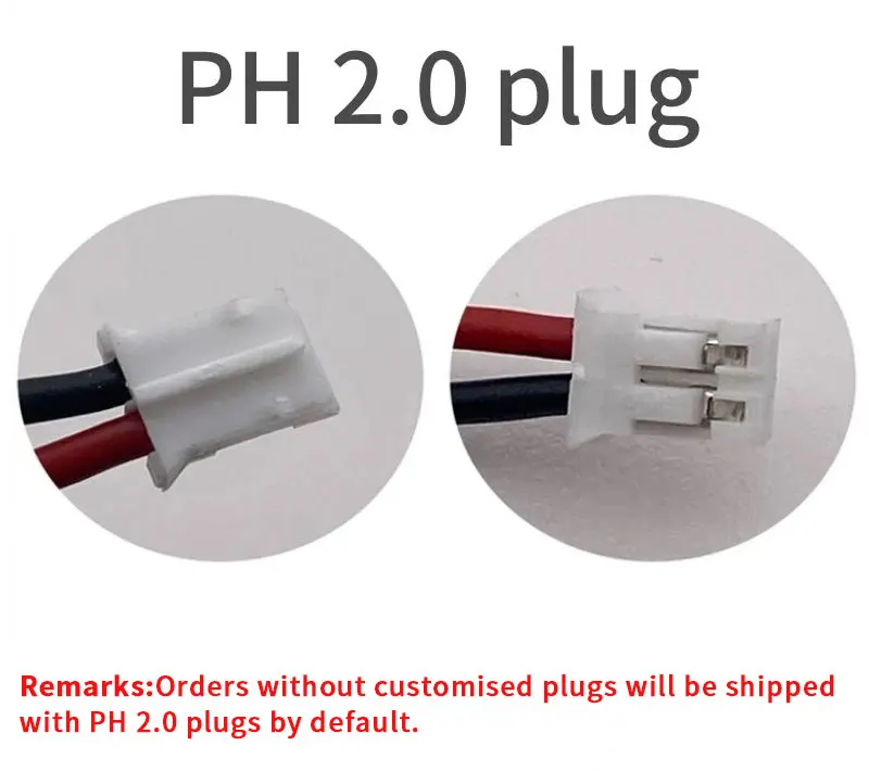 The default delivery is JST PH 2.0mm 2pin with plug.