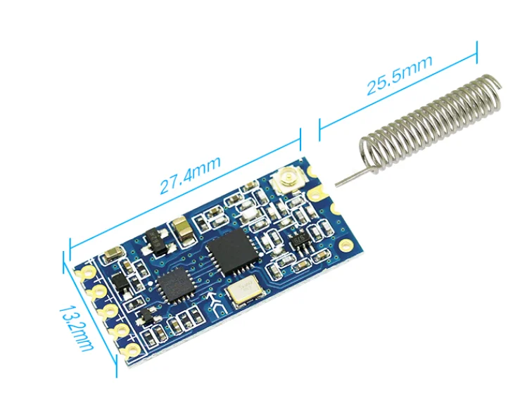 Distancia de comunicación predeterminada (prueba abierta): aproximadamente 600 m (ajustable para lograr una distancia máxima de comunicación de 1000 m, velocidad de transmisión aérea de 5000 bps).La corriente inactiva predeterminada: 16MA (módulos en diferentes corrientes de funcionamiento de los diferentes modos de funcionamiento).Tamaño del módulo: 27 mm × 13 mmRango de frecuencia de funcionamiento (433,4-47.0 MHz, hasta 100 canales de comunicación) Potencia de transmisión máxima de 100 mW (se puede configurar)El módulo admite actualizaciones de software.(Ofrecemos a los clientes actualizaciones de software)La configuración predeterminada de fábrica: modo de funcionamiento FU3, velocidad en baudios 9600bps, canal de comunicación CH001 (433,4M).