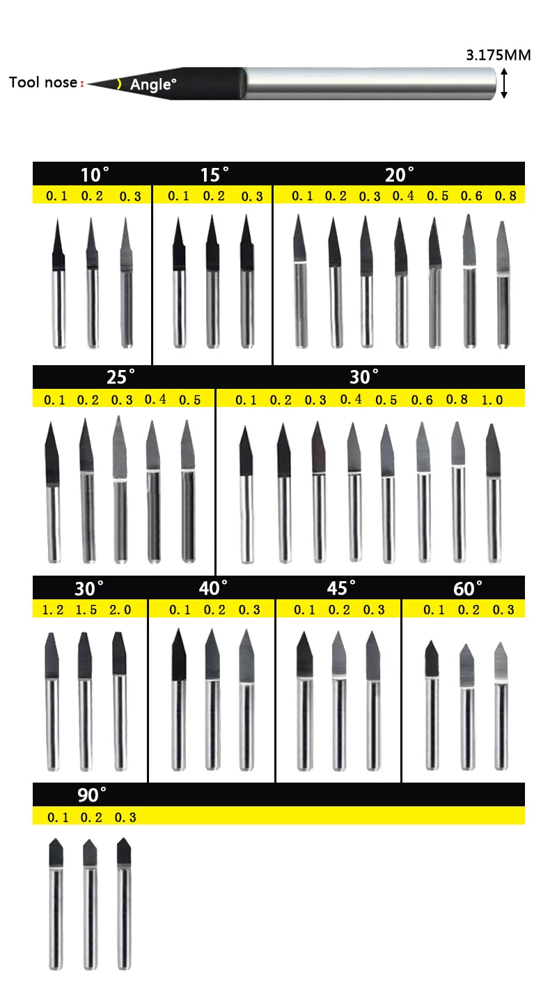Comprar 10 Uds 10/15/20/25/30/40/45/60/90 grados PCB broca de grabado V punta fresa de carburo de tungsteno 3D 3.175 1/8 fresa
