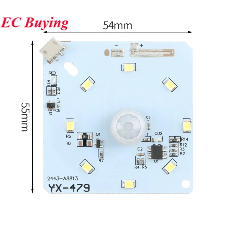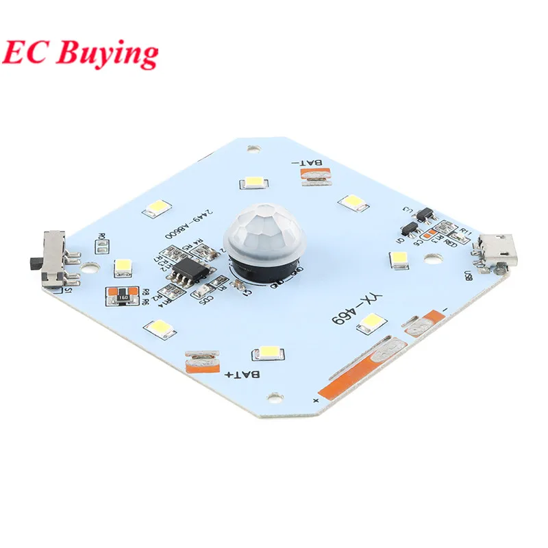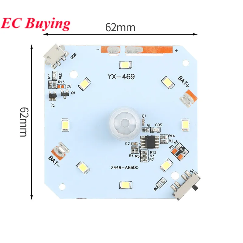 La placa YX-469 es diferente a las vendidas hace un año; faltan algunas resistencias, por ejemplo, la que se encarga del brillo de los diodos (cerca del microinterruptor entre 2 LEDs)... y así sucesivamente. Quizás simplemente se simplificó y refinó. Ambos que compré funcionan adecuadamente. Probado desde la fuente de alimentación a través del puerto de carga (consumo 0.7A), y por separado de la batería conectada a terminales opuestos en la placa. Al cargar la batería y simultáneamente cargar y operar la lámpara, la corriente se mantiene sin cambios (0.15A). Al finalizar la carga, me gustaría ver un indicador de cambio de color, pero no hay espacio para un LED... Y los puntos de salida adicionales en la placa junto al sensor PIR son poco claros, como si hubiera provision para extender más allá de la placa, además hay un LED al lado marcado como cds. . . He visto lámparas similares; aparentemente, esta es para un botón táctil, reemplazando un botón de sensor con un toque de dedo. . . Y asumí que el LED sería azul, pero cuando apliqué una potencia de 3v, no se encendió. . .